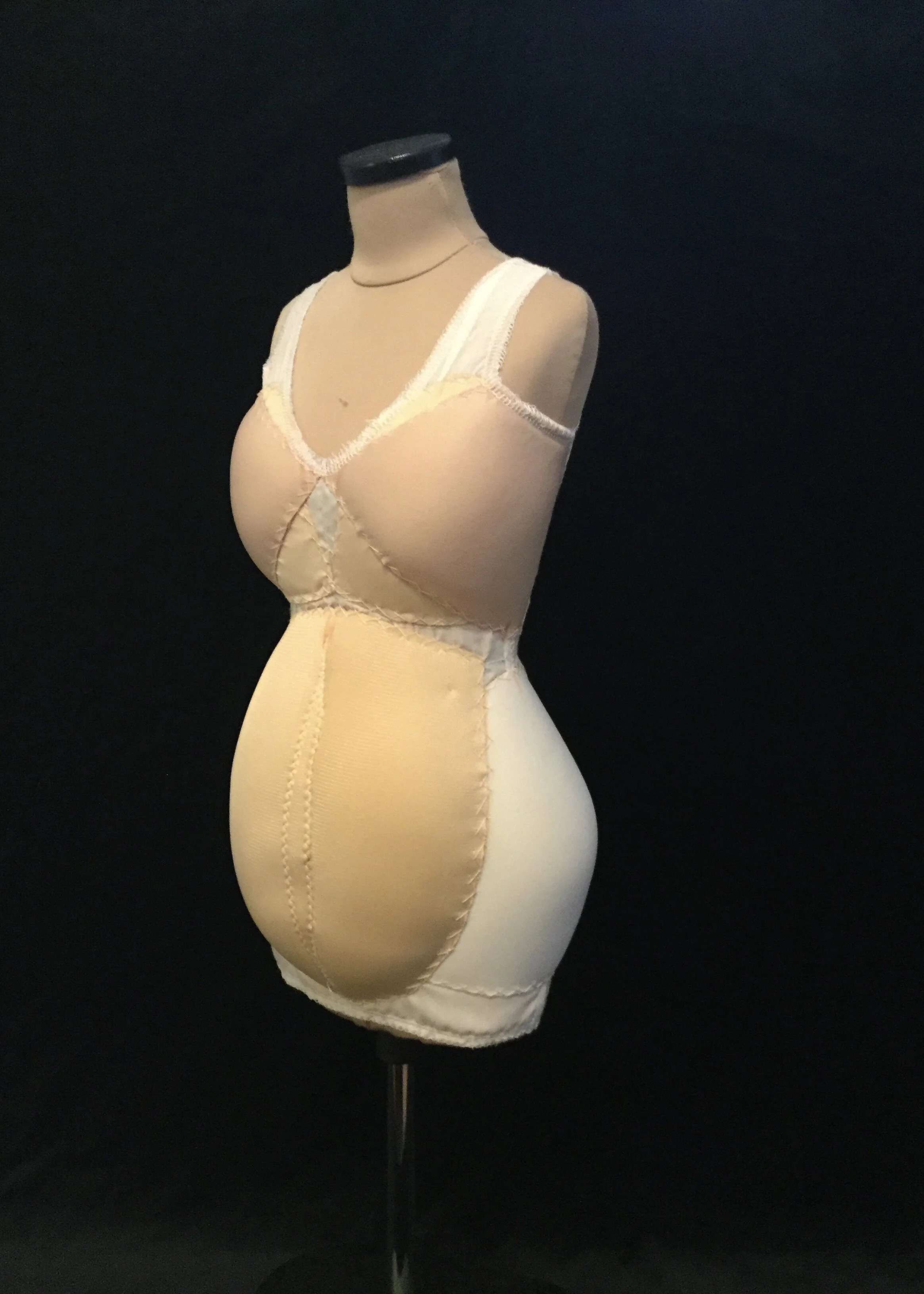 I started by experimenting with placement and layering pieces to build up the shape. I used larger cups over the hips and belly and smaller cups over the bust. The goal for the bust was to make it a bit bigger to give a more pronounced hourglass shape. I started with some foam cookies and covered them with a set of small, foam cups with a little bit of stuffing thrown in to pad out the sides a bit. Ultimately, I decided that the foam cookie was a bit too much and opted instead to use just the cups and stuff them with fibre fill. The large cup I used to make her belly was also a bit too full so I ended up taking out a tuck down the centre; I was aiming to still have a fairly slim waist with an outward curve lower down, closer to the hips. I built up the fullest part of this curve with a cookie and another small foam cup.