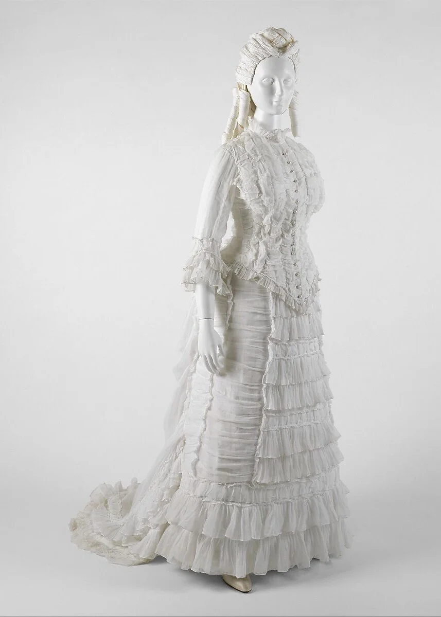 Dress. 1882. Metropolitan Museum of Art Costume Institute, https://www.metmuseum.org/art/collection/search/95534?searchField=All&sortBy=Relevance&deptids=8&ft=1880+dress&offset=60&rpp=20&pos=68