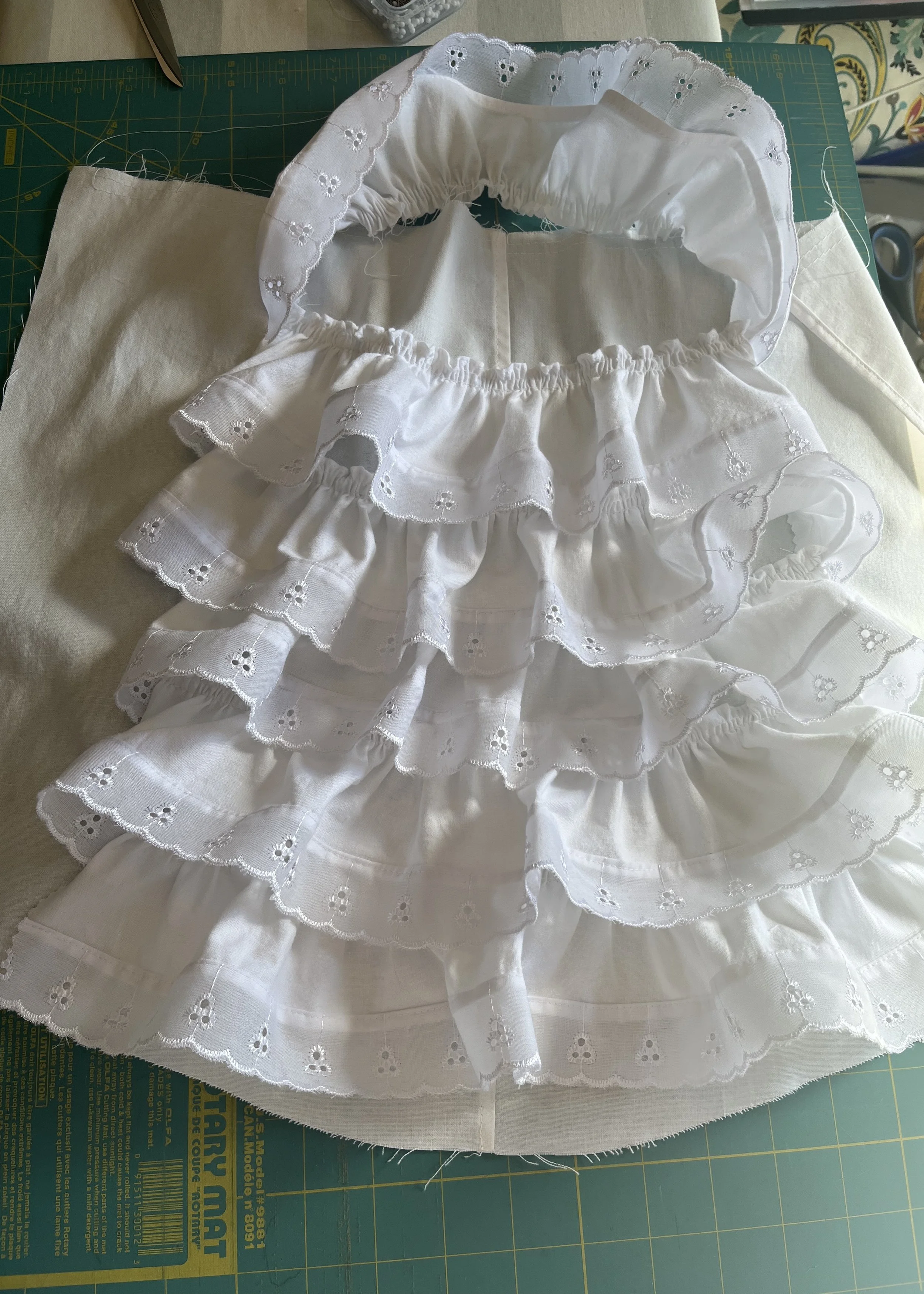 I put the petticoat back onto my Judy at this point to establish the seam line for the flounce. She wasn't going to get anything super floofy, but she did need little bit of flare towards the hem. I also cut the flounce a little longer at the centre back to give her a little bit of a train. I marked a level line on the skirt and cut an even seam allowance, being sure to leave plenty to use later to bind the flounce seam.