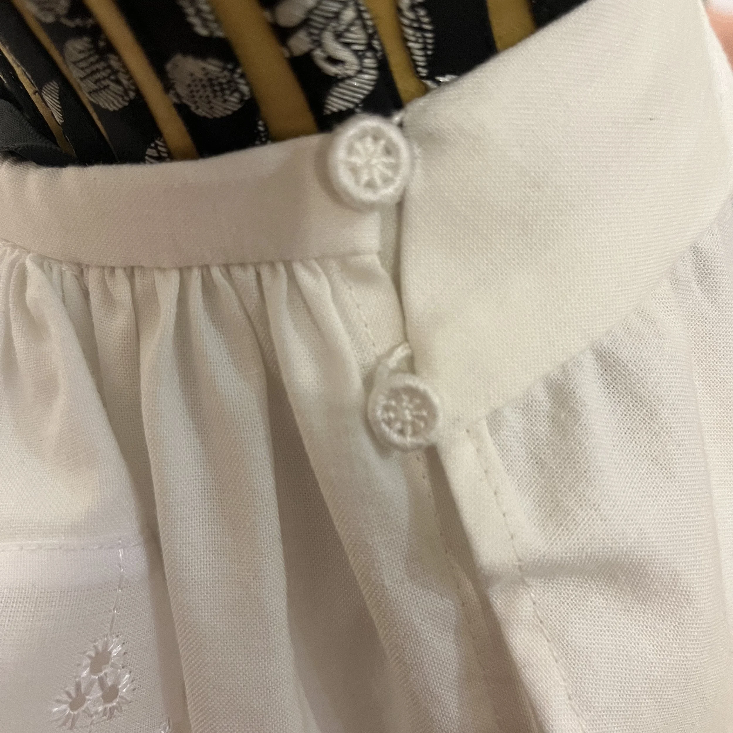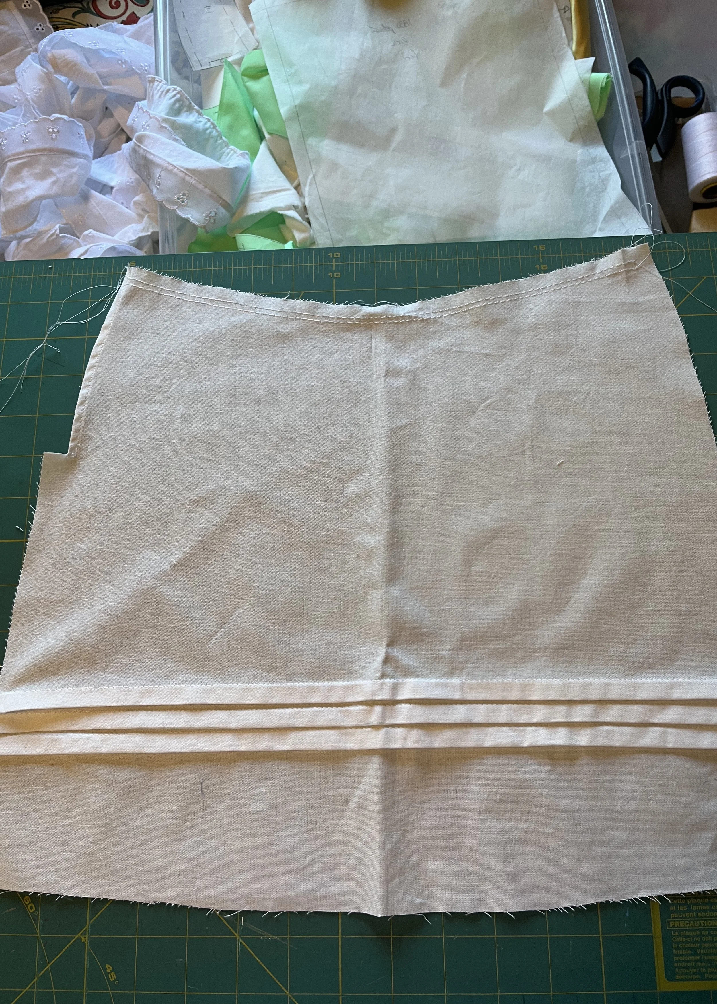 Next, I stitched the three tucks across the front, finished the right side to the base of the closure with a small double turn and ran gathering stitches across the top edge. I stitched the front to the yoke, gathering it slightly, and finished the right side of the yoke where the closure would eventually be.