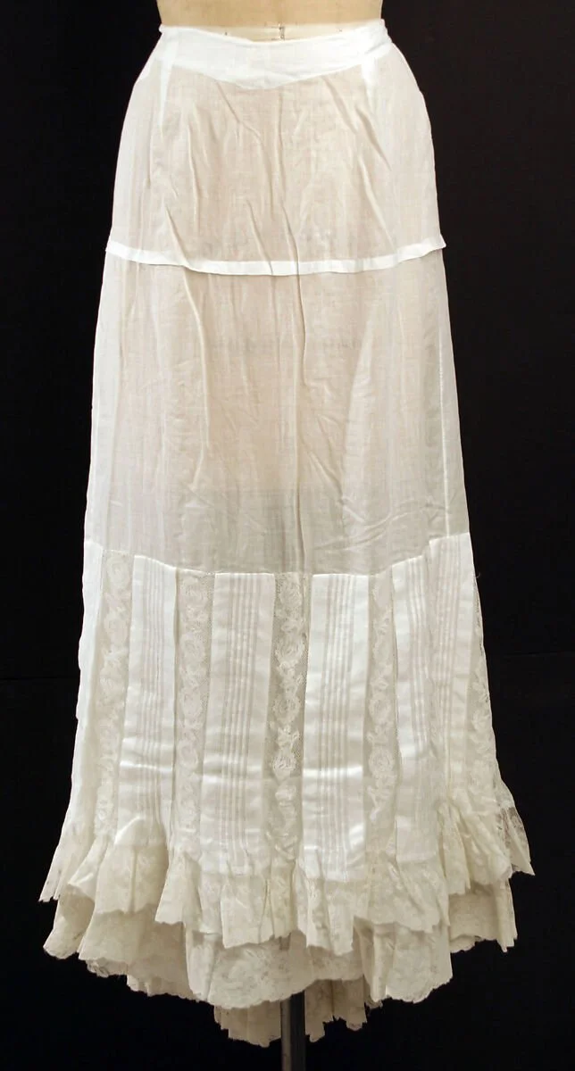 So, the petticoats I looked at mostly appeared to be fairly straight skirts with perhaps a bit of flare and some lace or flounces around the hem which were not particularly full; pretty much in keeping with the shape of the gowns of the time. However, the back might be a different story. There I found glorious cascades of ruffles...sort of. As with the combinations, petticoats in 1880 have some embellishment and ruffles, but are not quite as full and flouncy as they will be closer to the end of the century. But do not despair! There is still flood to be had! In order to support the growing bustle and to enhance, and probably smooth over, the shape of whatever structure was underneath, the petticoat might have several flounces down the centre back and it does appear that they could be embellished a bit if desired.
