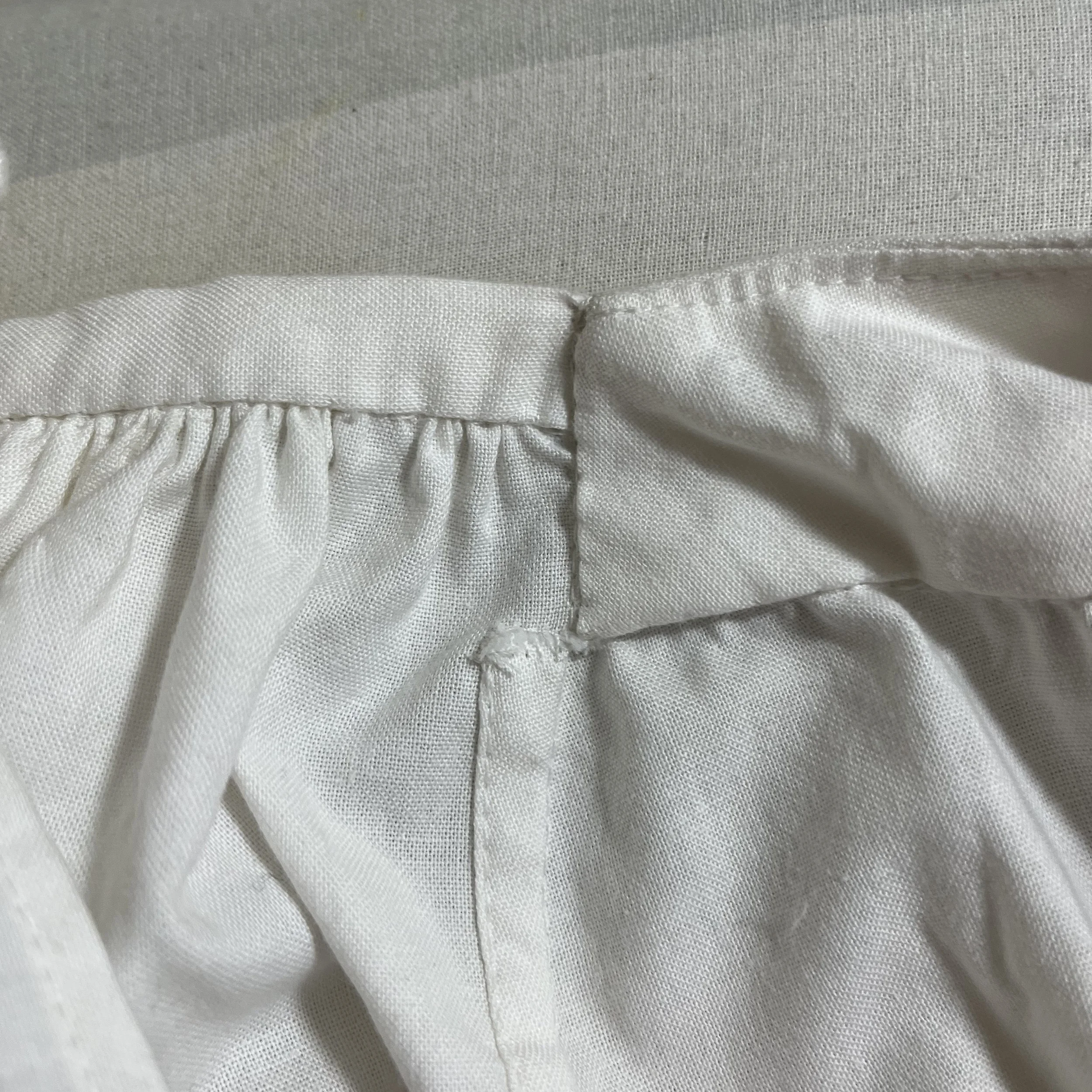 With all the ruffles on, I gathered the back waist to the desired length and stitched it onto a waistband, enclosing the top ruffle as well. I then stitched the front to the back, finishing the seams with more flat felling and enclosing the top of the left seam in the yoke which I then finished.