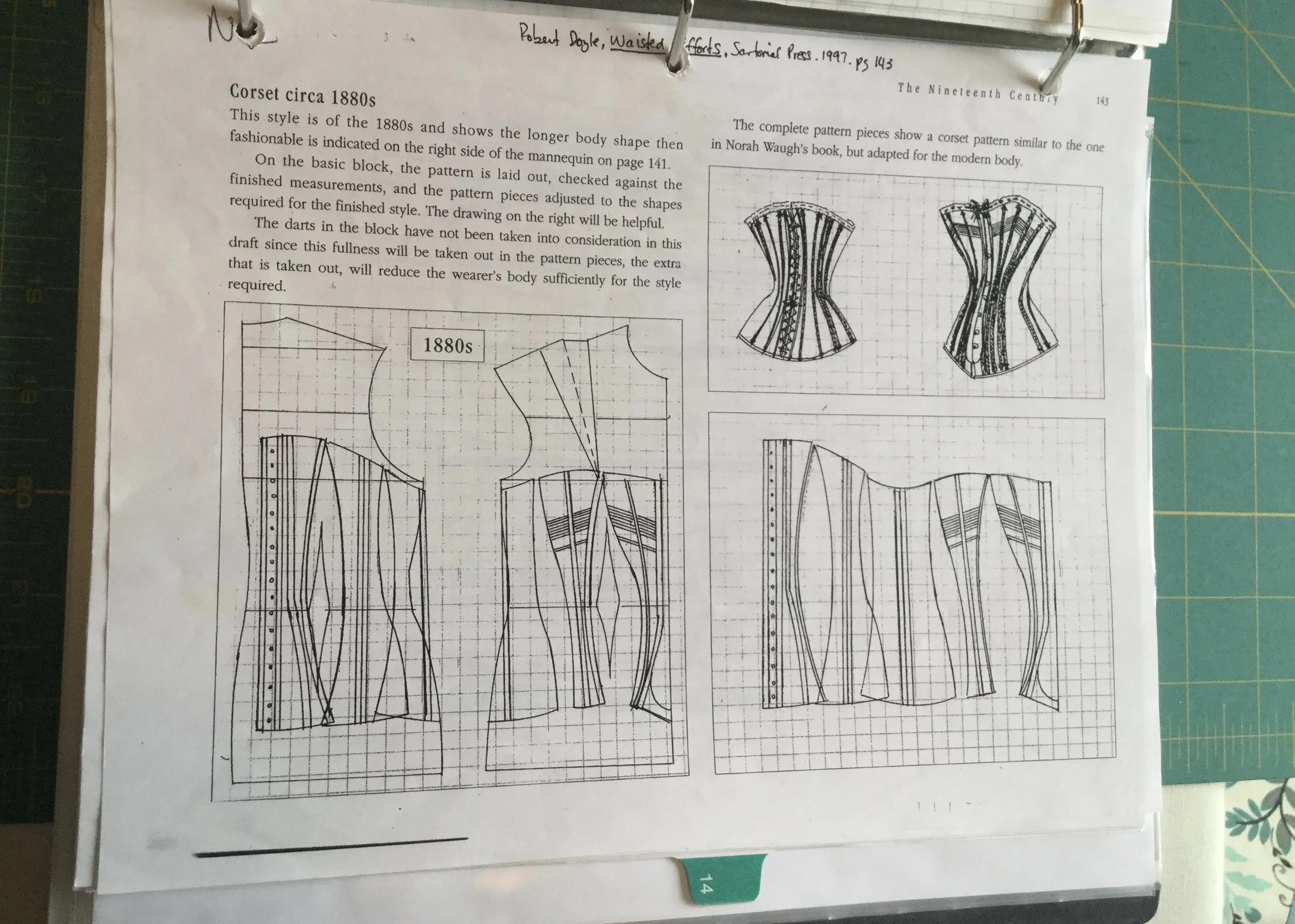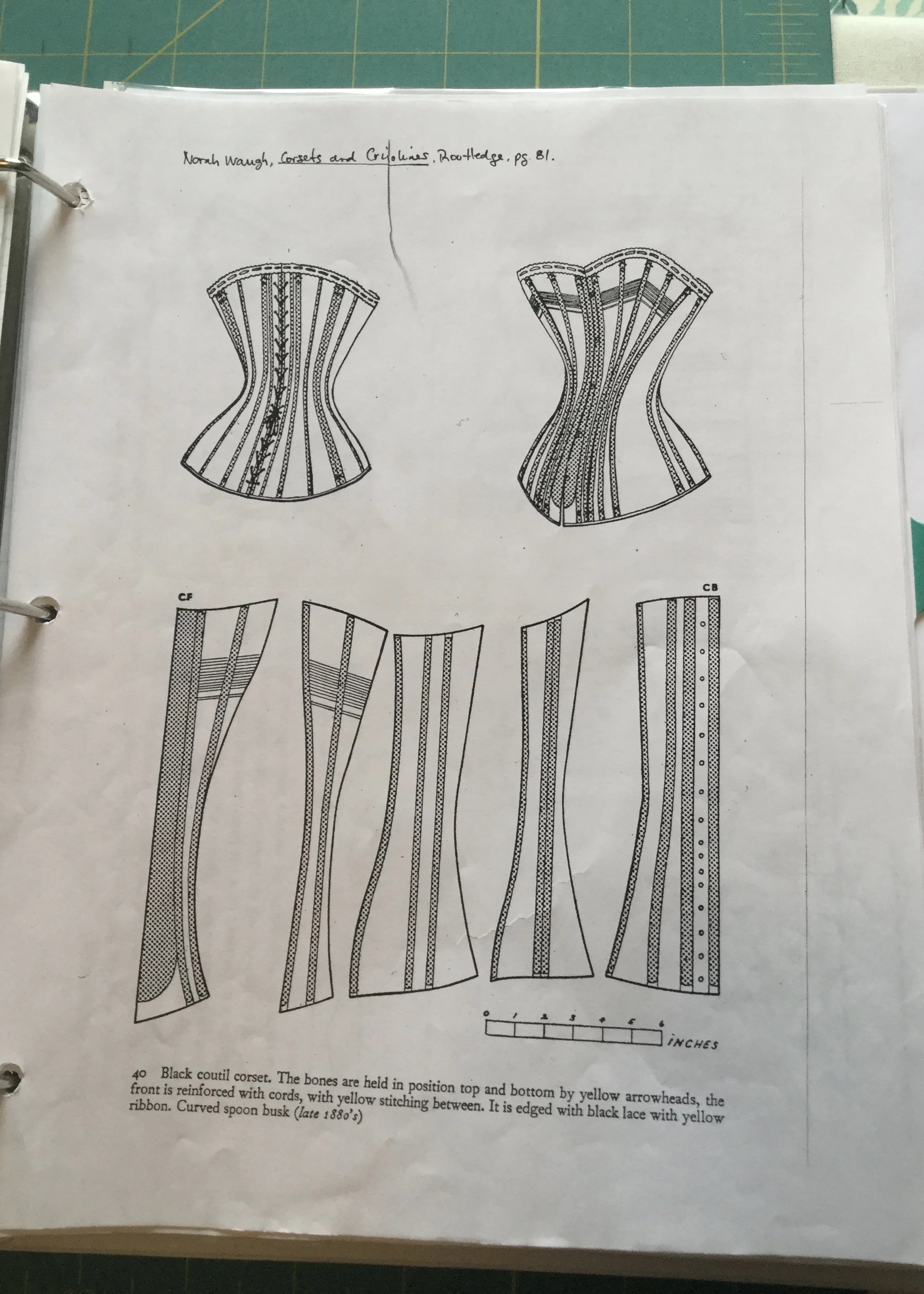 For a clear idea of what I would try to make, I actually began with a quick look through some old notes from school. In my second year at Dalhousie, the theatre department mounted a production of Lady Windermere's Fan, for which the students in costume studies built the costumes, including corsets for all the ladies. As luck would have it, the references we had used for those corsets were for the period of time I was looking for. From these notes, my main source for the shapes of the various pieces was from Norah Waugh's Corsets and Crinolines; specifically a diagram of a corset from the late 1880s (a bit late but the shape is still right). I also referred to diagrams by Robert Doyle in his book Waisted Efforts to get a sense of where each piece sat in relation to the basic block.