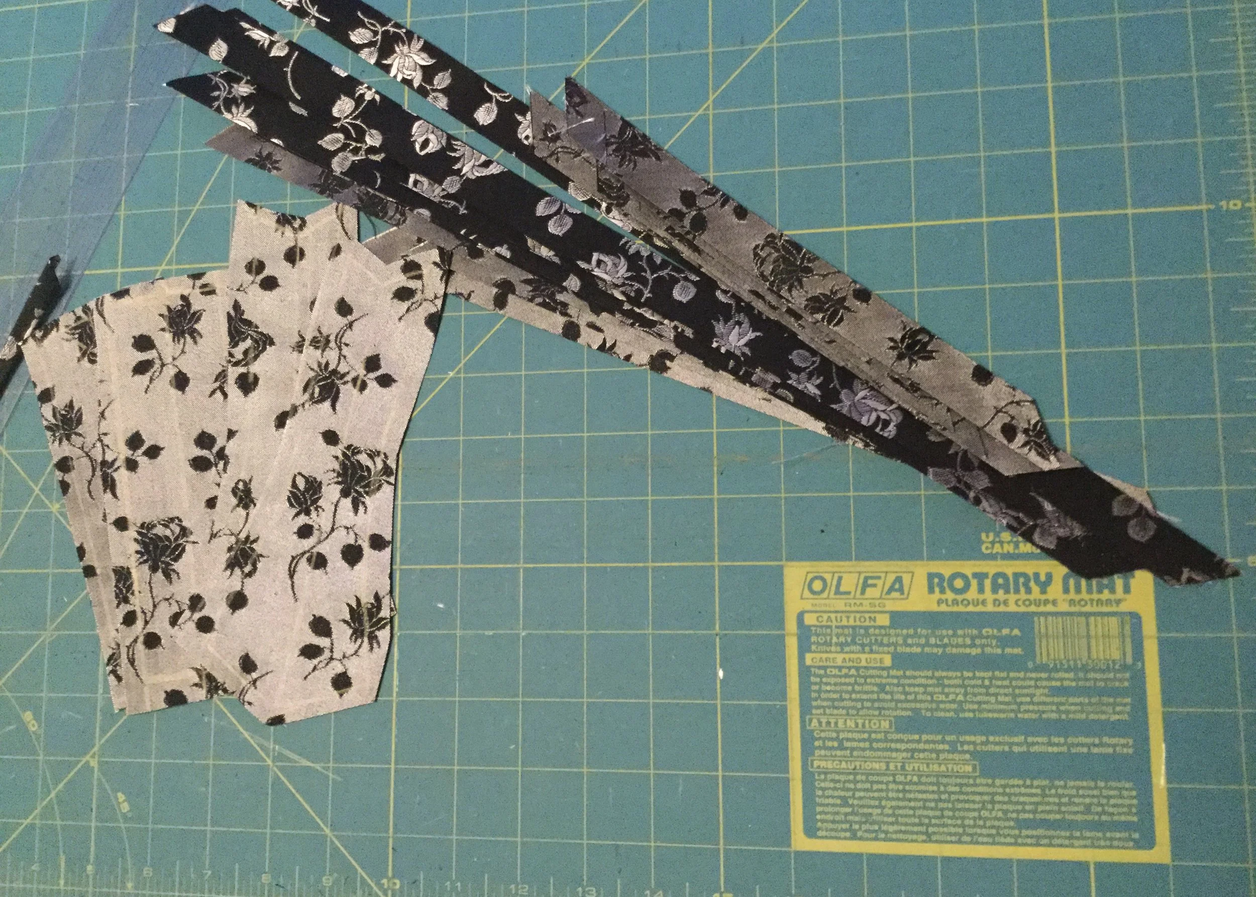 I traced off the front and back facings but before cutting them out, I cut my bias for the bone casings. I was a bit stingy with the seam allowance for the front and back facings which would give me a bit of grief later, but for the moment I had them cut and as much bias as I could get and if it wasn't enough...well, I'd cross that bridge when I came to it.