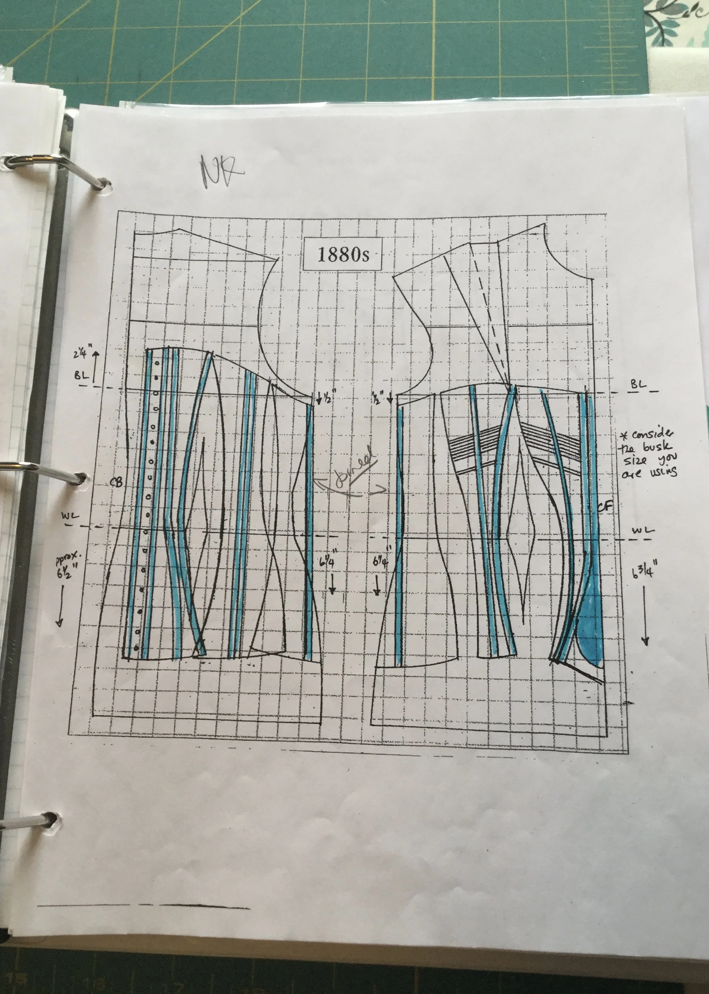I didn't do quite as much hemming and hawing over what would be accurate when it came to the corset as the desired shape was not as much in flux at this time as the other elements of ladies' clothing were. The longer, hourglass shape, popular for the cuirass bodices of the 1870s, was still being worn and had not yet evolved into the straight fronted, S-curve of the late 1890s and the turn of the century.