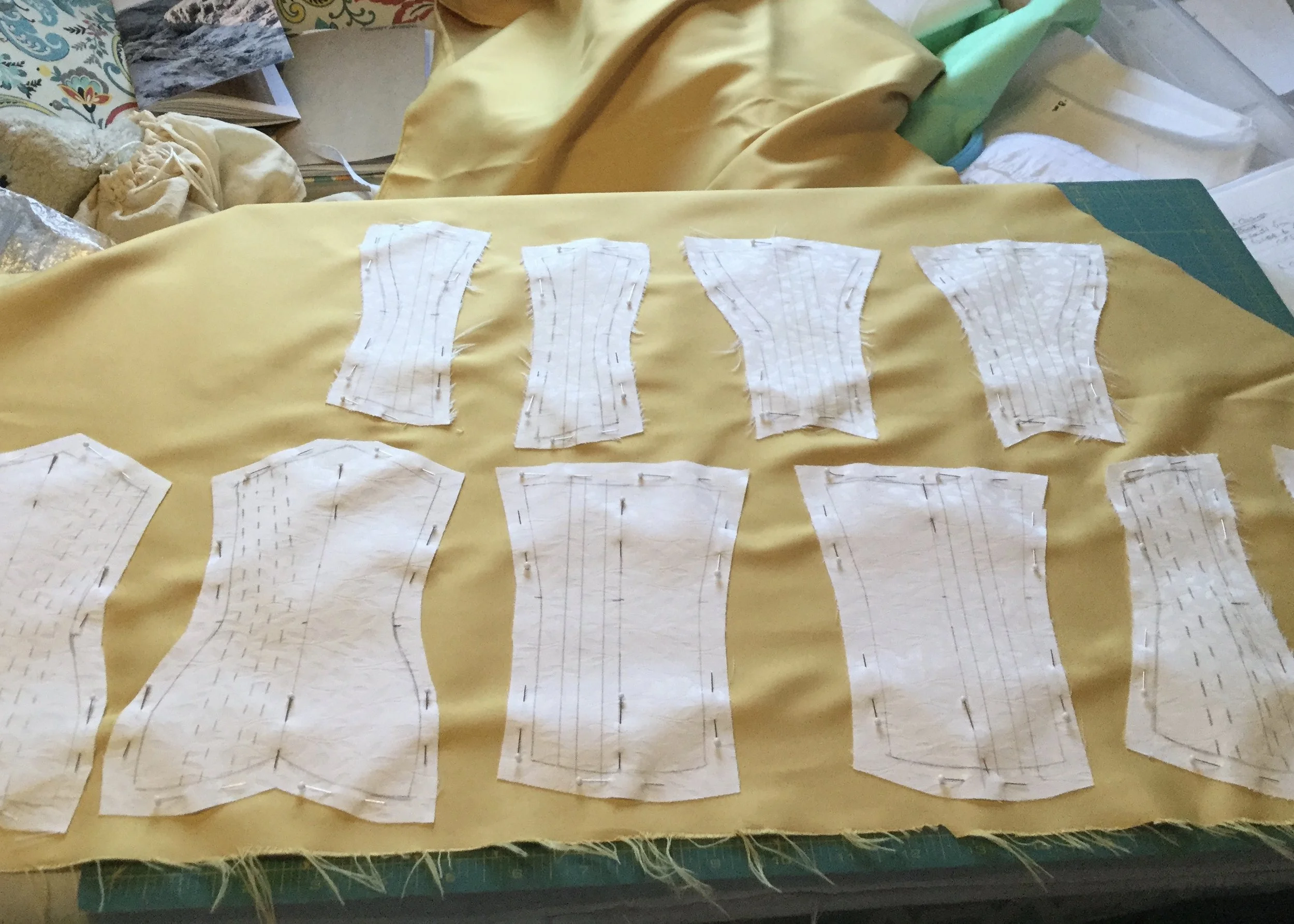 I then laid the coutil pieces onto my satin, pinned them together and cut the satin. I also cut the casings for the centre fronts and backs out of the contrast coutil. It was here that I realized the piece I had wasn't quite as big as it had been in my mind and that the fronts and backs would take more fabric than I had imagined they would.
