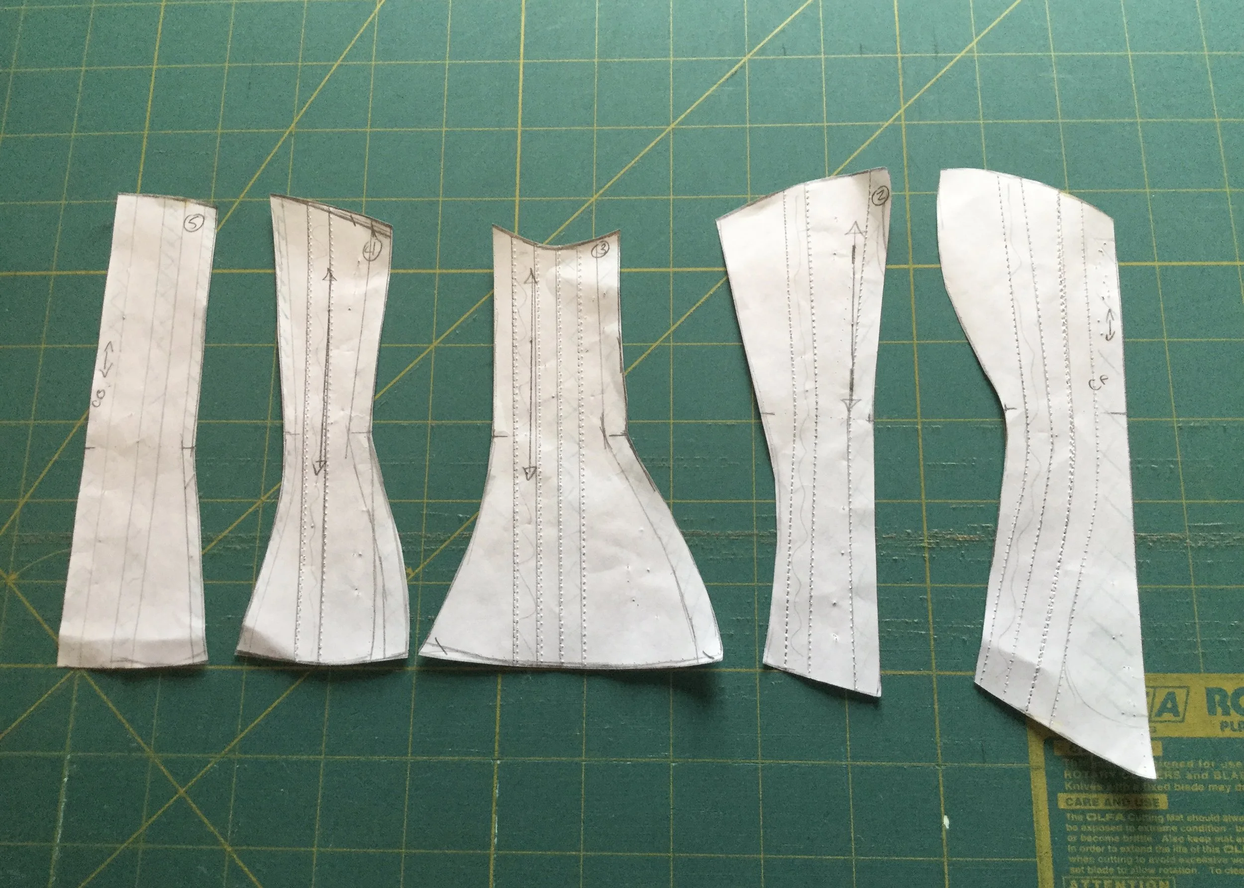 Given how well the mock up worked, I decided to reuse it as the base of the final corset and only recut the centre front and back pieces as I needed them to be on the double to create the casings for the busk and the bones on either side of the eyelets. (In hindsight, I actually did not need the entire piece to be on the double and I was a bit stuck in the how you cut and make corsets for real people headspace, but live and learn.) After drawing the bone placement on the pattern pieces, I cut my new fronts and backs, took apart and pressed the mock up and traced the bone placement onto the coutil.