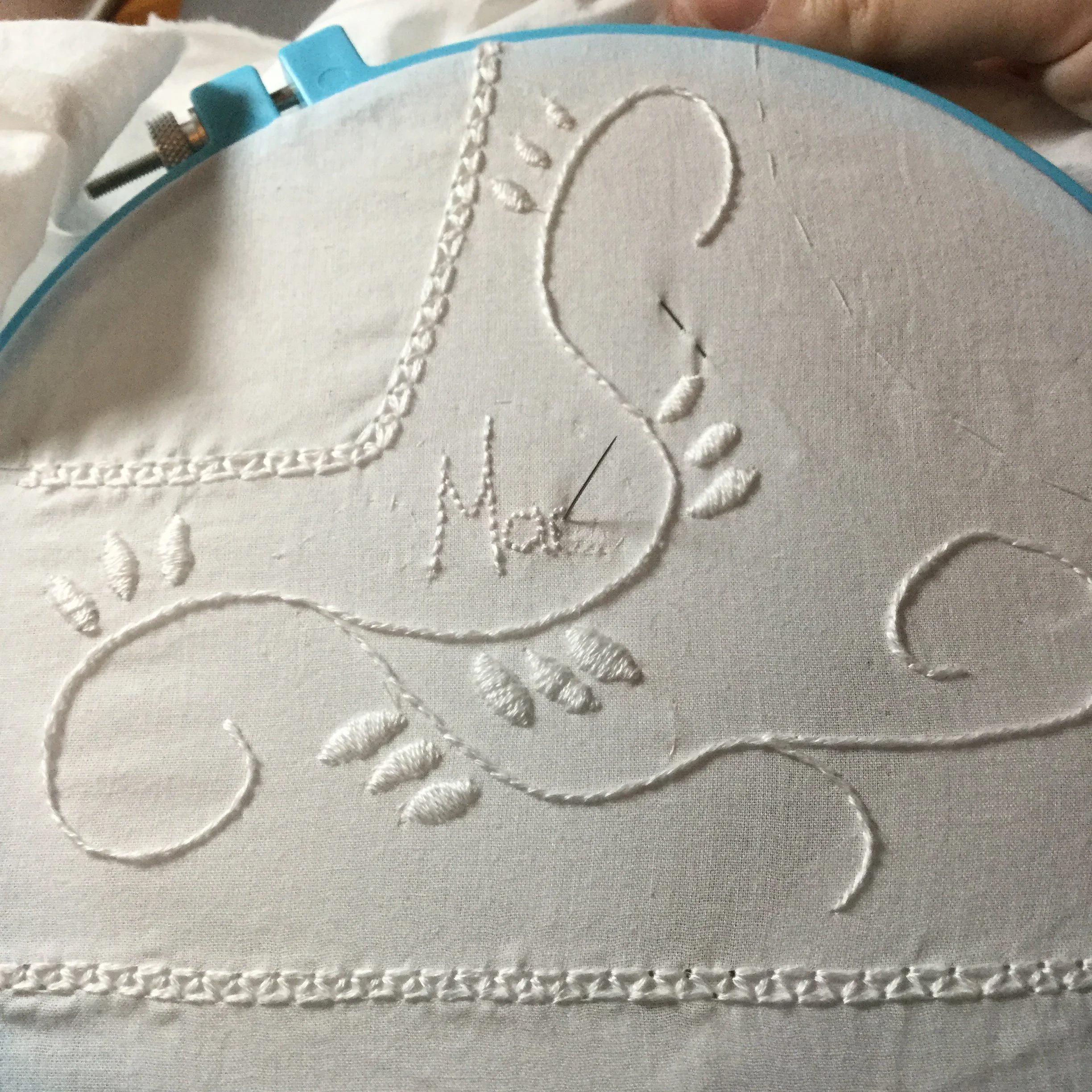 Embroidery in progress. (You can tell that I was definitely not measuring my border stitches by counting threads.)
