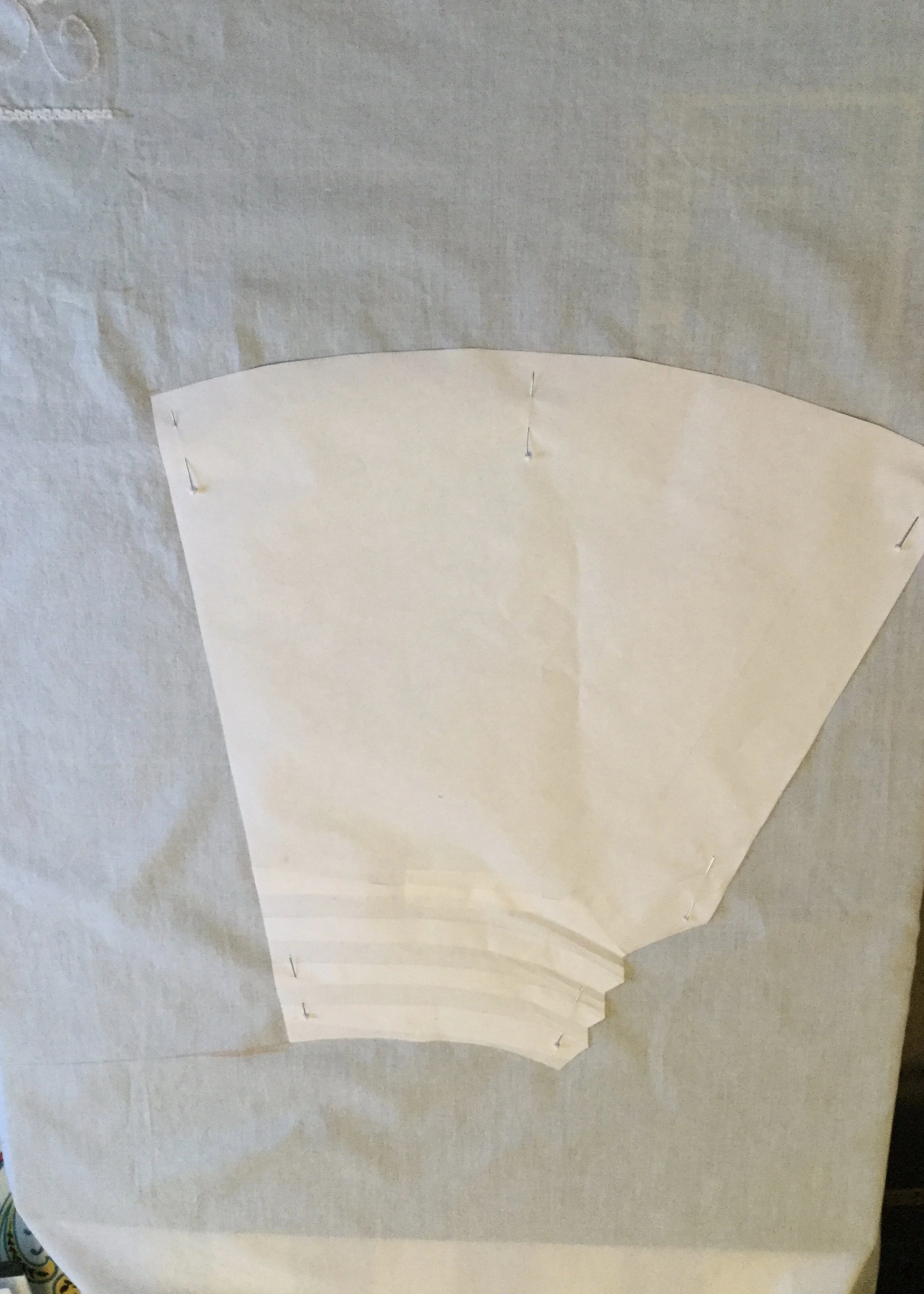 With all this pinning done, I began to transfer my alterations to the pattern. To prevent another wedgie situation, I not only dropped the crotch a bit but I also opened up the whole pattern at the waistline and lengthened it by 3/4''. I also redrew the side seam of the bodice to curve out a bit under the arm; in my research I had read and seen that a lot of chemises were cut or had sleeves added to sit in the underarm to absorb sweat and protect the outer garment, kind of a built in pit pad. I ended up straitening it out again later, but still leaving some excess for that purpose (altogether far too much effort for someone with no arms, let alone armpits).
