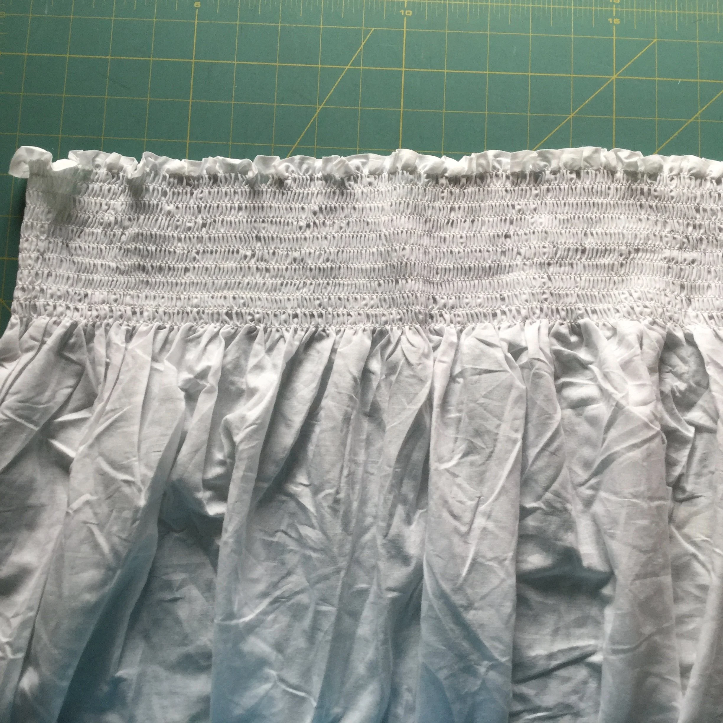 For material, I used a light cotton that I had found at fabricland. While on a routine wander through the den of temptation, I happened upon a bin full of rolls of cotton with elastic shirring (the kind of fabric where you can buy a meter, stitch one seam and have a dress or skirt you'll be adjusting all day). They were all 100% cotton in a fairly light weight and there was a roll of solid white, this had potential.