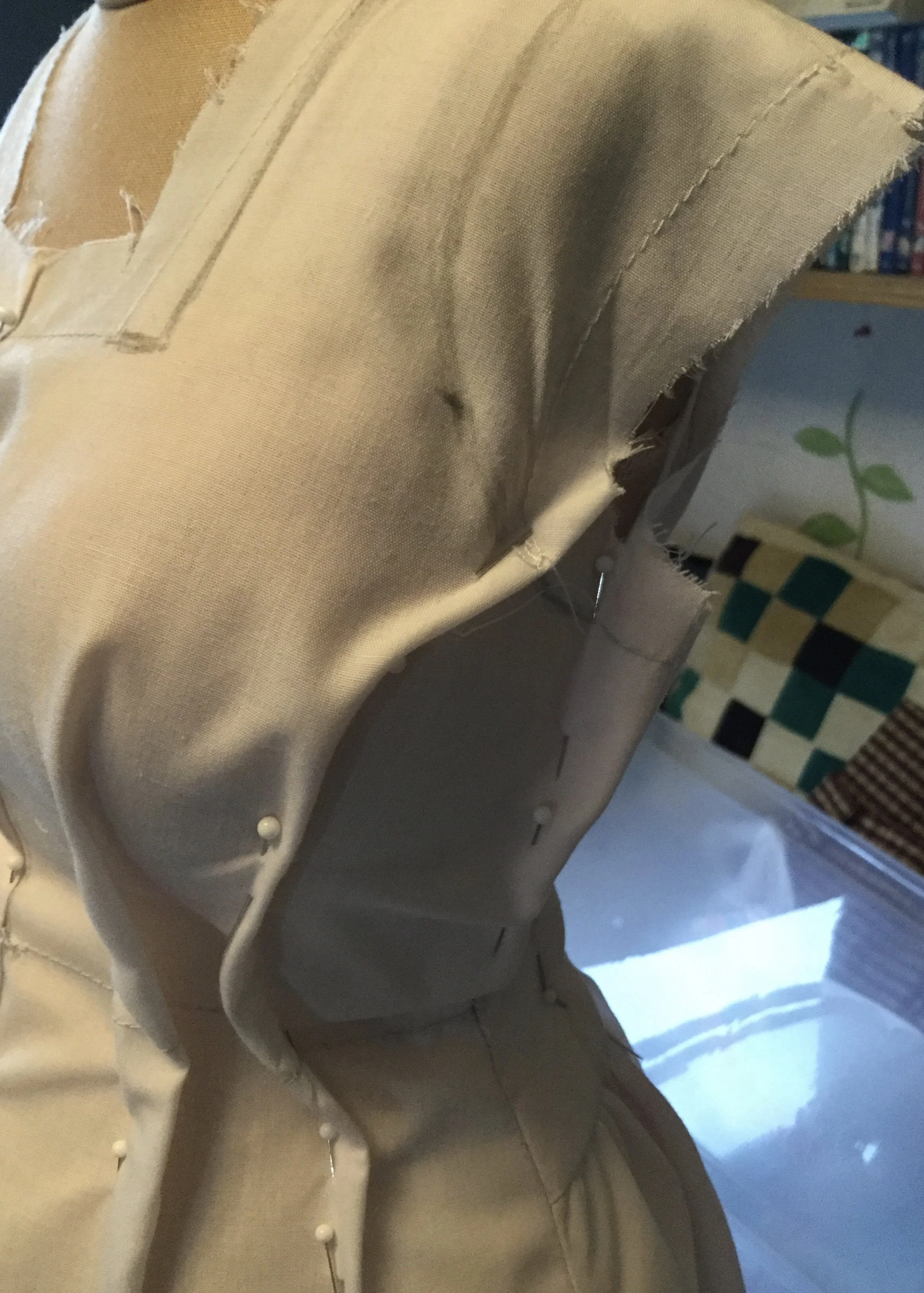 The first alteration I tackled was to pin out the waist darts and pinch out a little on the side seams under the arm. Once the whole thing was looking a bit more shapely, I turned my eye to smaller adjustments.