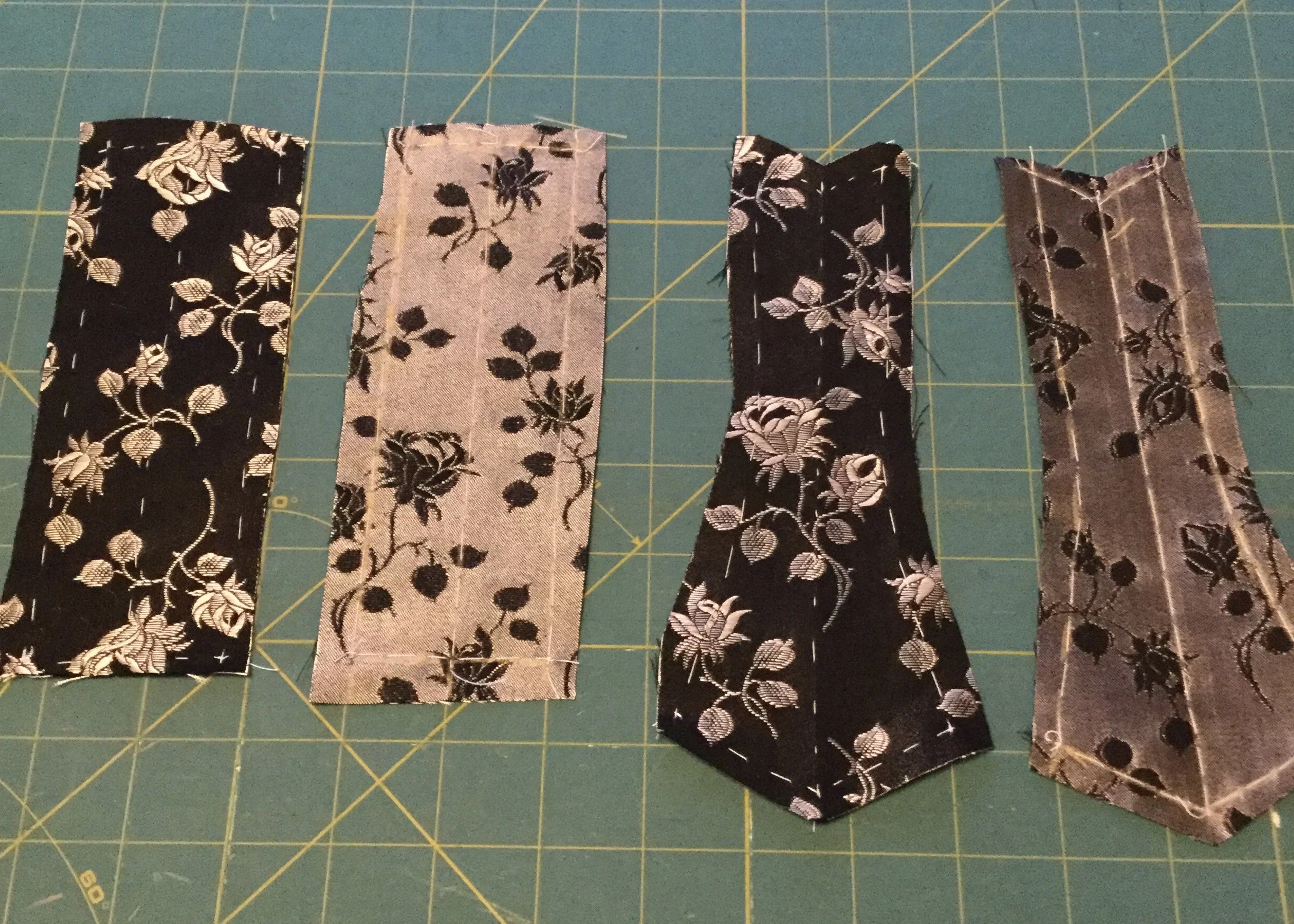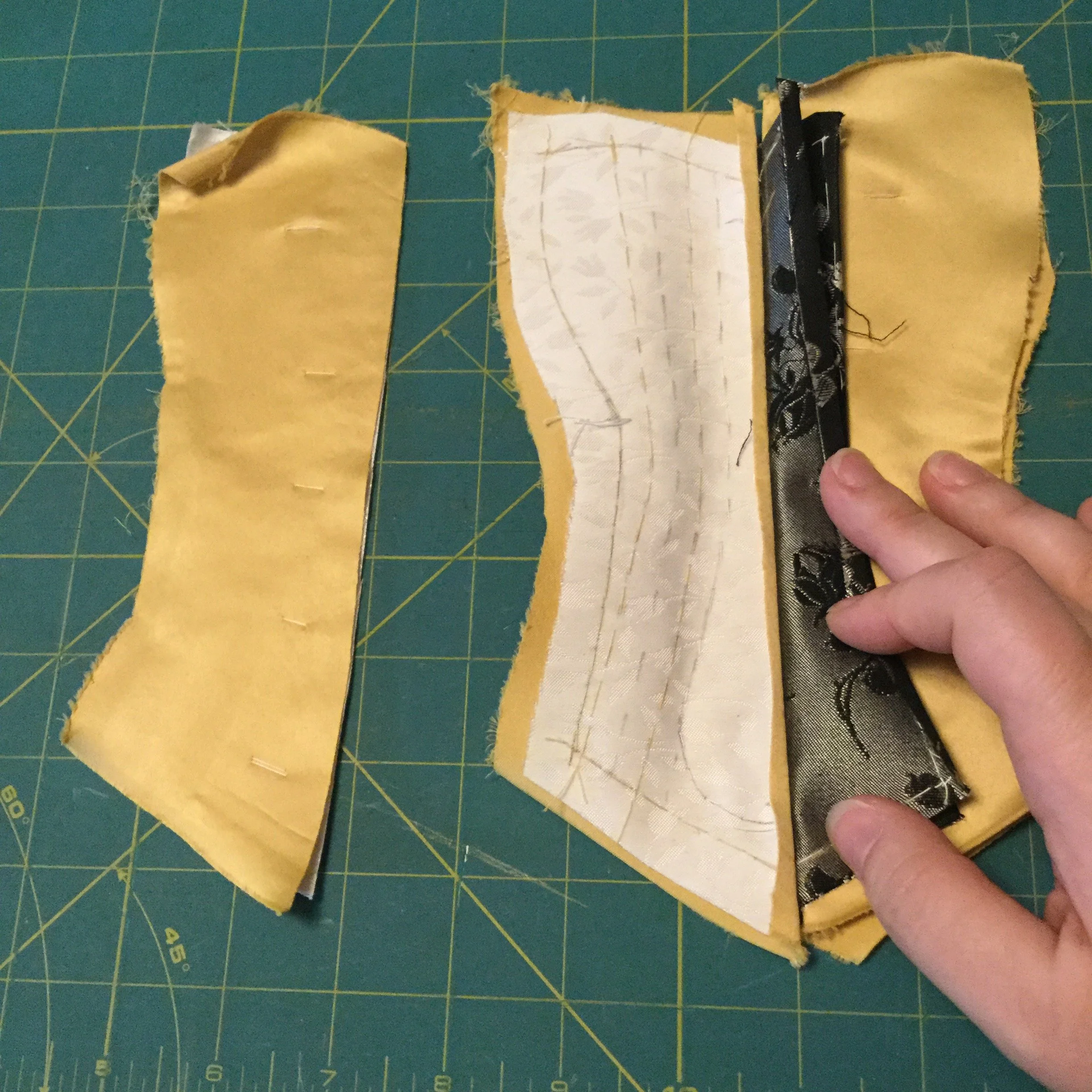 The first section I put together was the centre front. Since they don't make tiny busks (again, could be so cute!) the two fronts are stitched together and there is no functioning front closure. To start, I basted the facing to the satin along the fold line at the centre, offsetting the stitch by a wee bit so I didn't catch it in the final seam. After prepping both fronts, I stitched them together, leaving a centimetre or so open at each end to make binding the edges easier. I then pressed the seam open.