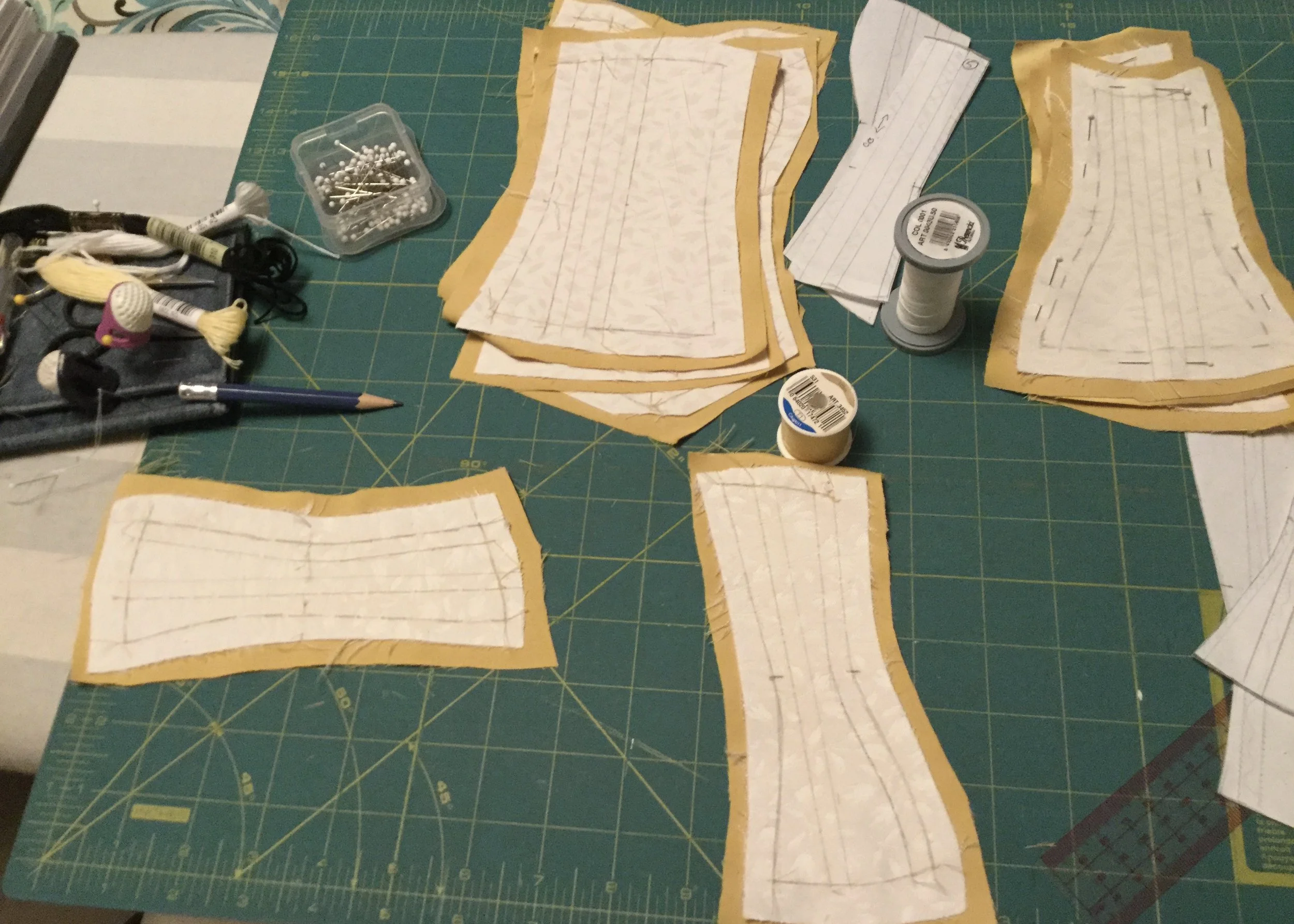 The first step of the body of the corset was to flat mount the satin to the coutil. I hand stitched it along the seams, top and bottom edges and one side of each bone to act as a guide when I applied the casings. I also basted the centre and seam lines of each of the facing pieces.