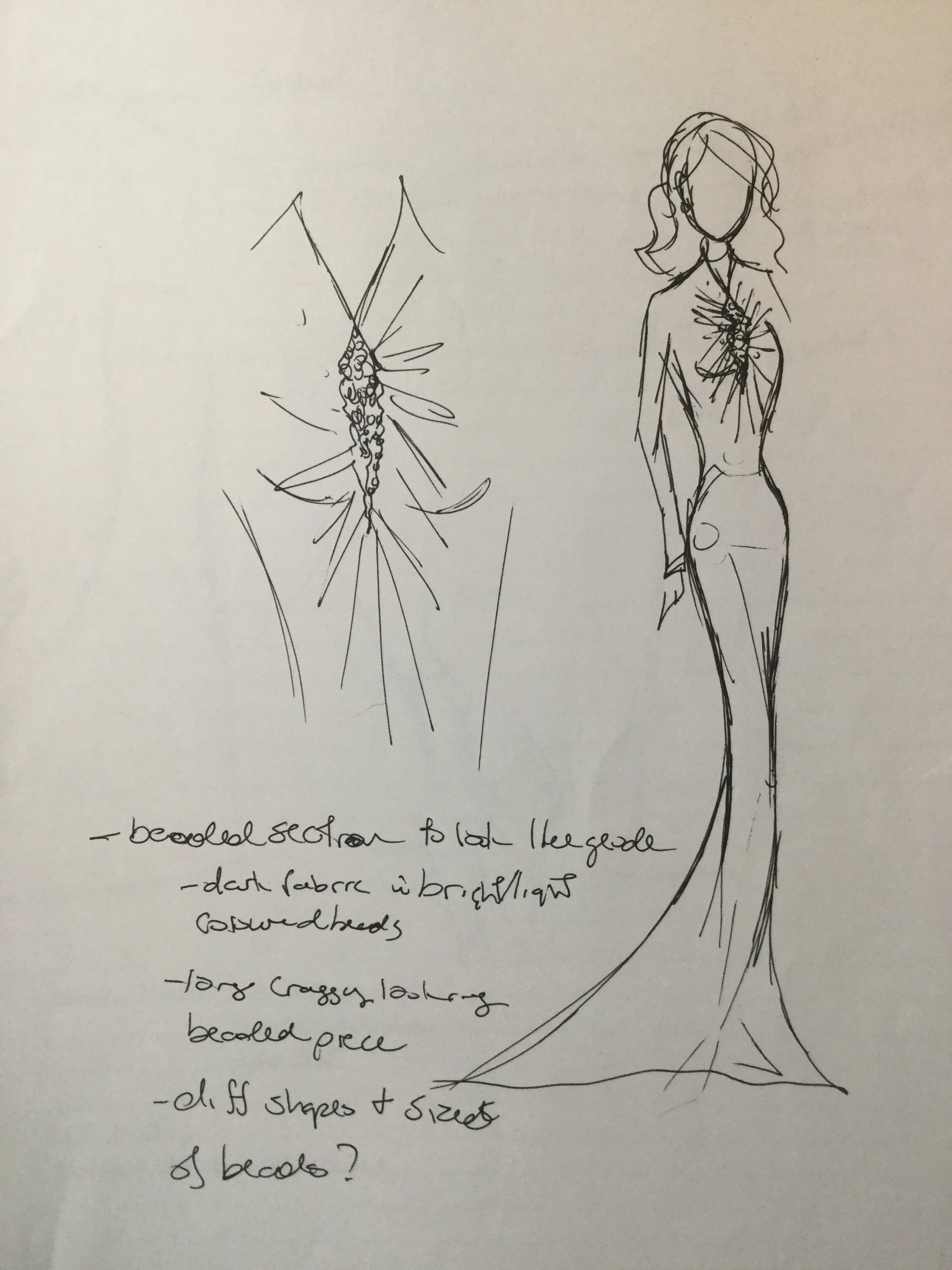 I can see now that it was at least in part because I didn't yet have a clear idea of what the jewels at the neck and centre back would be; on the drawing they were just represented by a little oval shape which did successfully communicate that there would be something there, but wasn't particularly inspiring. I don't remember exactly where the notion that it would be cool to make it look like a geode came from but when that idea came to me the plan for the whole dress was suddenly much clearer.