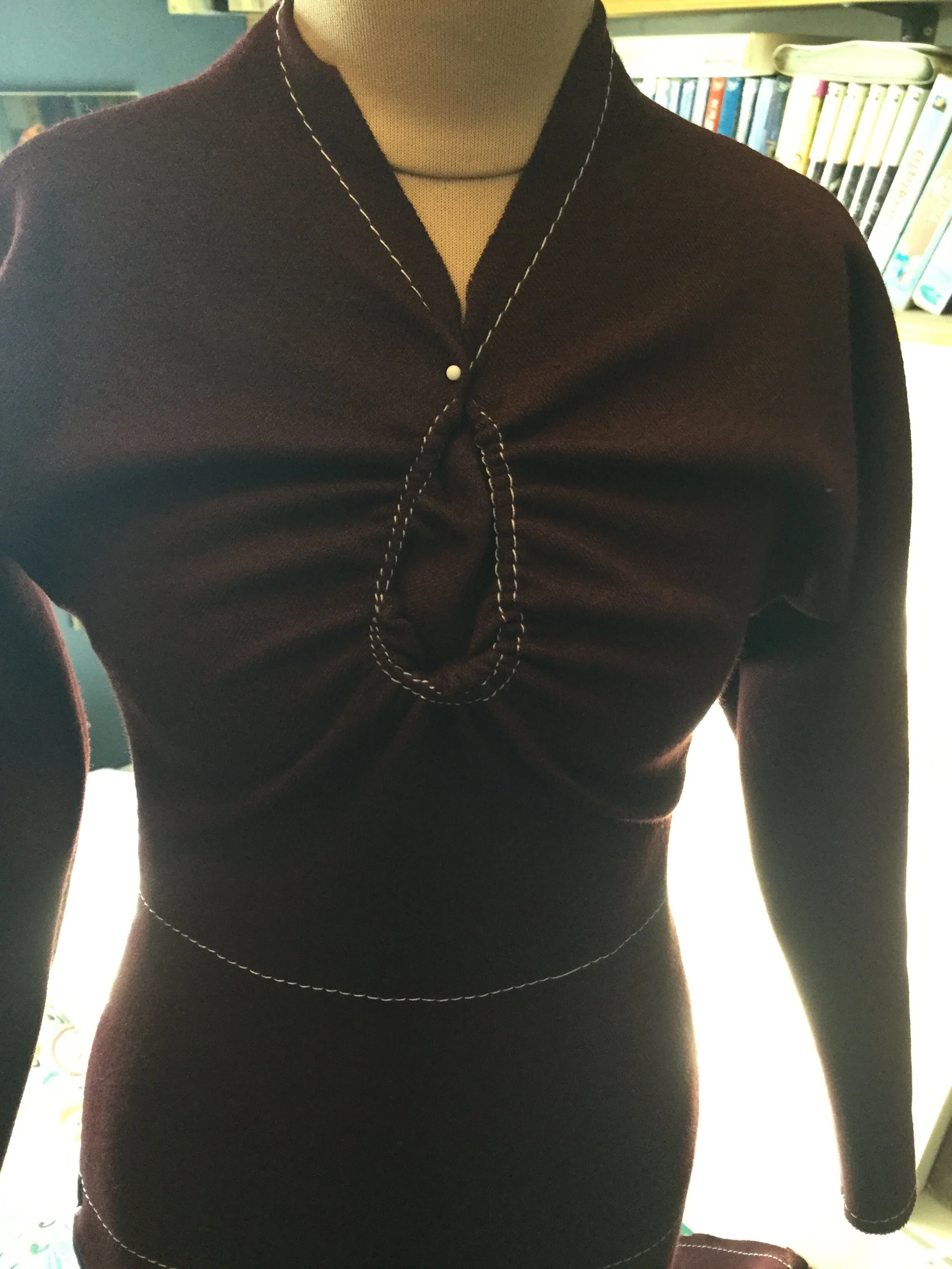 I kind of figured it out but I was not entirely successful. I was using a knit fabric for the mock up as I knew that I would use a knit for the final dress but here's the thing about knits: they stretch. Even if my gathering lines were not technically on the true centre front, the fabric didn't offer up any resistance to being pulled to meet at the centre. So that was a bit of a waste of time. I did revisit the idea more successfully when I got to the final build, but decided that trying to incorporate it into the pattern might not work how I wanted it to.