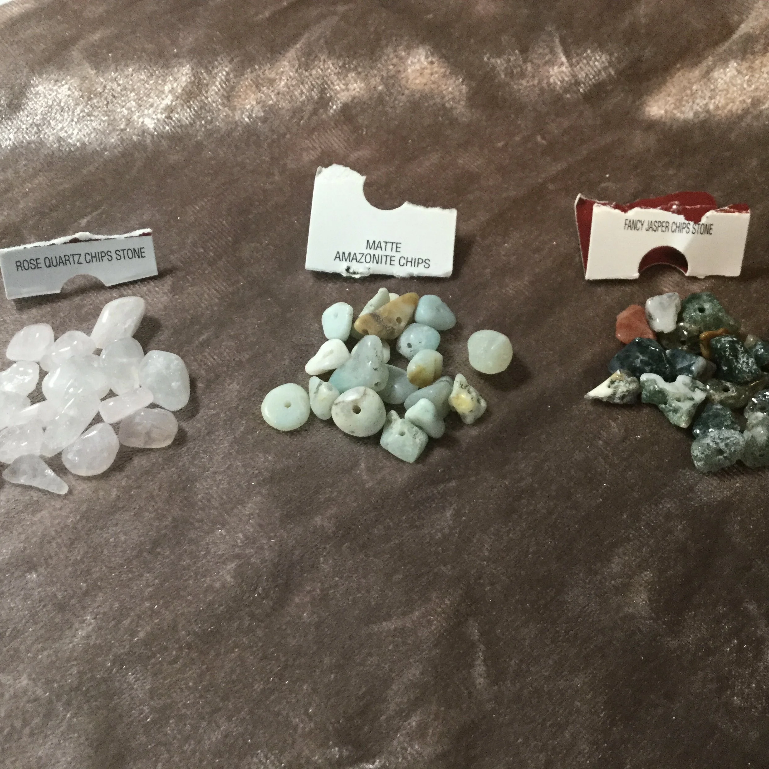 At first I was gravitating towards amethyst; it wasn't a particularly interesting combination to me, but it was pretty and came in a number of different sizes and colours which could have looked interesting with the geode idea. I was on the point of heading for the register when I took one last look at the various possibilities and suddenly noticed the fancy jasper. I settled on it almost immediately as it had some variety of colours and looked pretty and more interesting against the fabric colour than the amethyst. I added the amazonite and quartz to have some lighter colours to fade out a bit towards the edges and get a bit more of the geode look. Also, green is rarely mistaken for most parts of human anatomy.