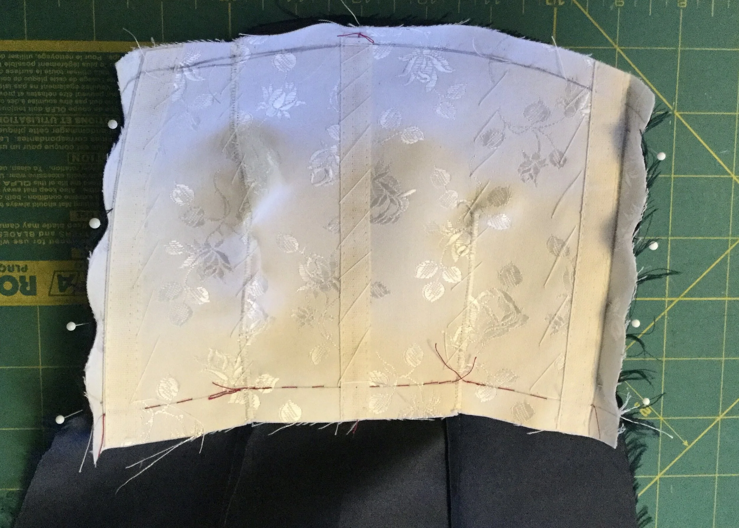 Darts closed, basted to the satin, pinned and ready for stitching.