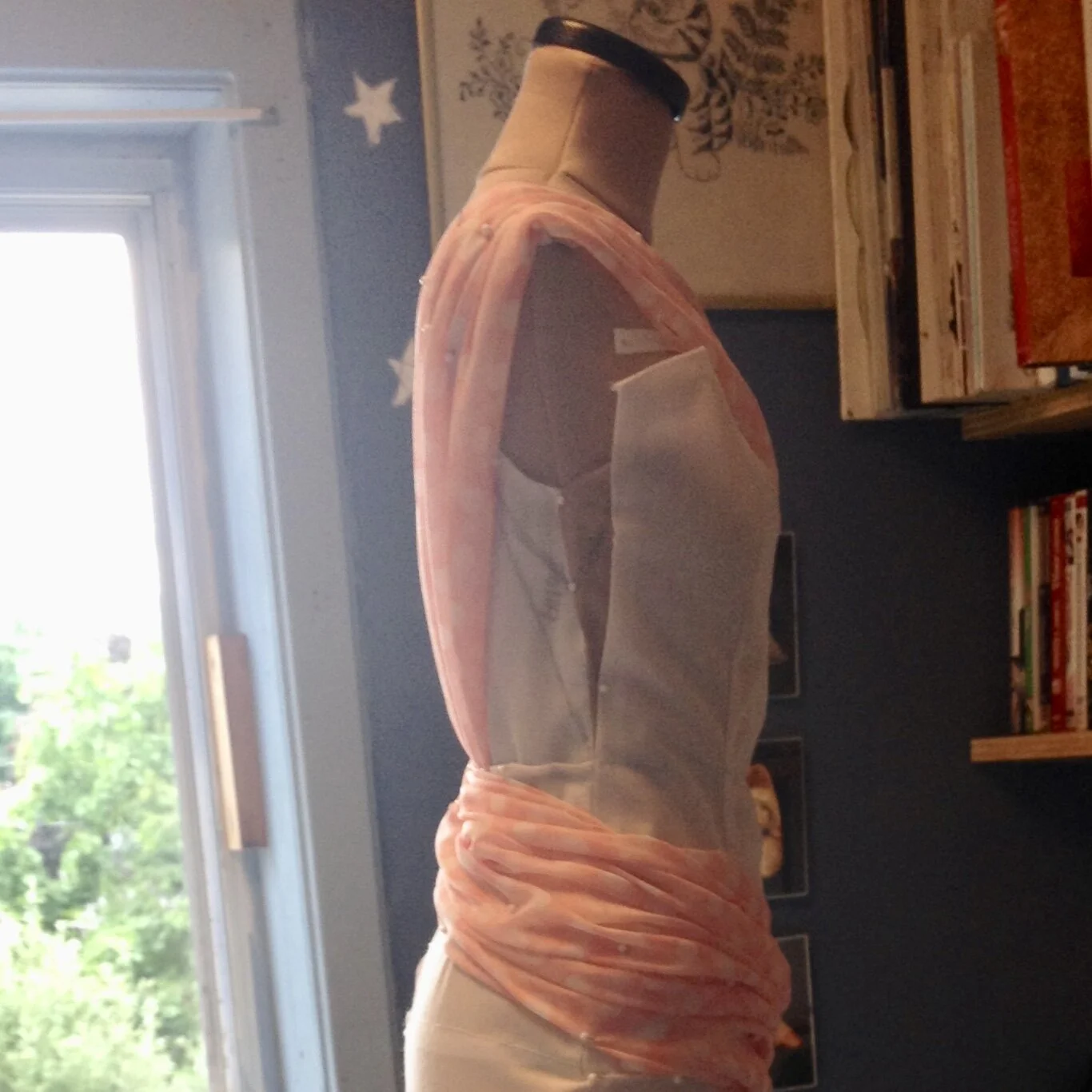 After closing the darts, I pinned the foundation in place on the mannequin and was pleased to discover that it fit quite well; all my careful taping and easing had worked and the edges of the foundation were hugging her tiny curves quite beautifully. If I was to build this in full scale, I might have chosen a different material or found a way to include a little more structure; possibly backing part of the piece with a heartier fabric and even finding a way to build in some cups. I was a bit worried that I should have cut the strap a little longer over the shoulder, but I could still make up for that with the back piece; it would be fine if the back had to come a bit farther to front as it would all be covered by the tulle anyway. Tulle isn't famously see through, right?