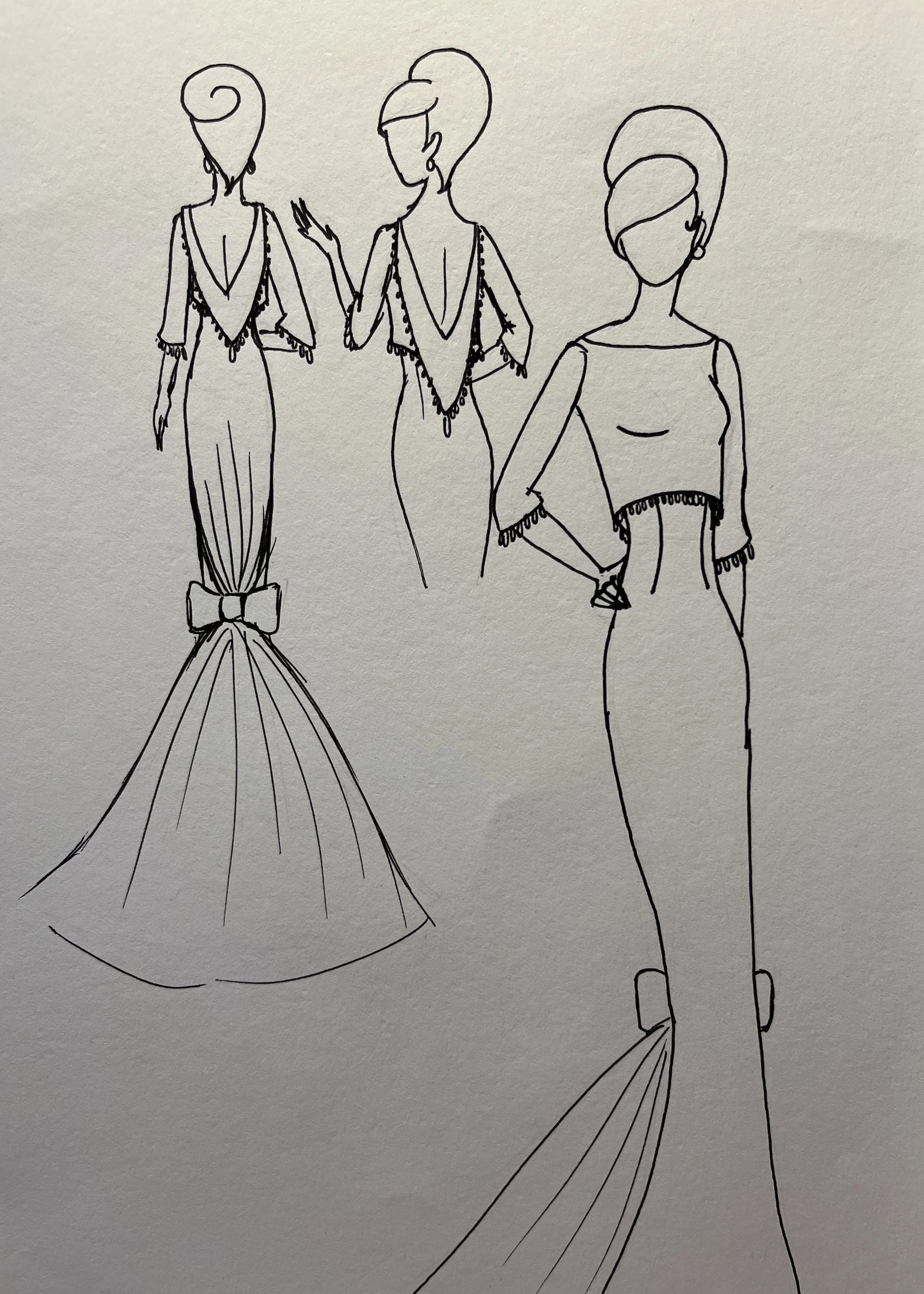 I did add a few touches of my own though. The first, which can be seen in both drawings, is the different neckline in the back. I changed it to a deep 'v' with an added piece which would hang from the shoulders (henceforth to be known as a sash as that is what I call all random bits that hang off of my dresses for which I cannot think of a better word). I also always imagined the beading along the hem of the over bodice as being more teardrop shaped than round (admittedly, in part because of my faulty memory of something I saw once in a movie). I'm pretty sure the idea of lengthening the dress and adding the train and the bow came later, though I can't tell you where the idea came from; perhaps it was simply a stroke of genius. One of my beliefs in life is that the big bow is a design element which is best used sparingly, but for this dress I kind of liked it and it seemed to work; there was something about it which fit well with the 60's aesthetic.