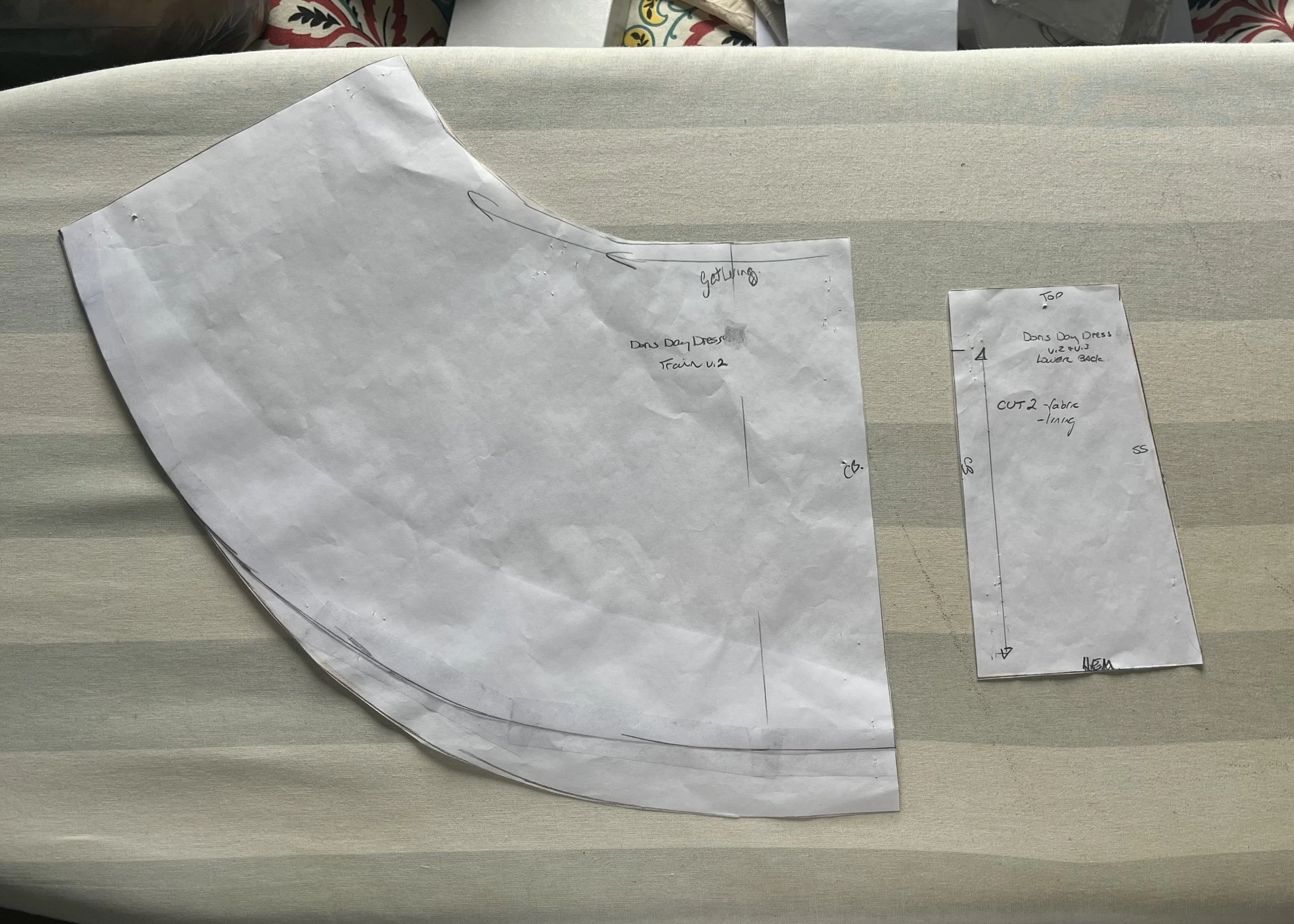 For the second mock up, I tried adding the train piece so that I could start working out what shape it needed to be. My first draft of it more or less worked, but it wasn't quite the right shape and looked a bit sad and flat (I mean, why have a train at all if it's only going to be a sad little thing?) I slashed and spread the train to add more fullness as well as lengthened it at the centre back to deepen the curve along the hem and allow it to trail behind the dress a little more.