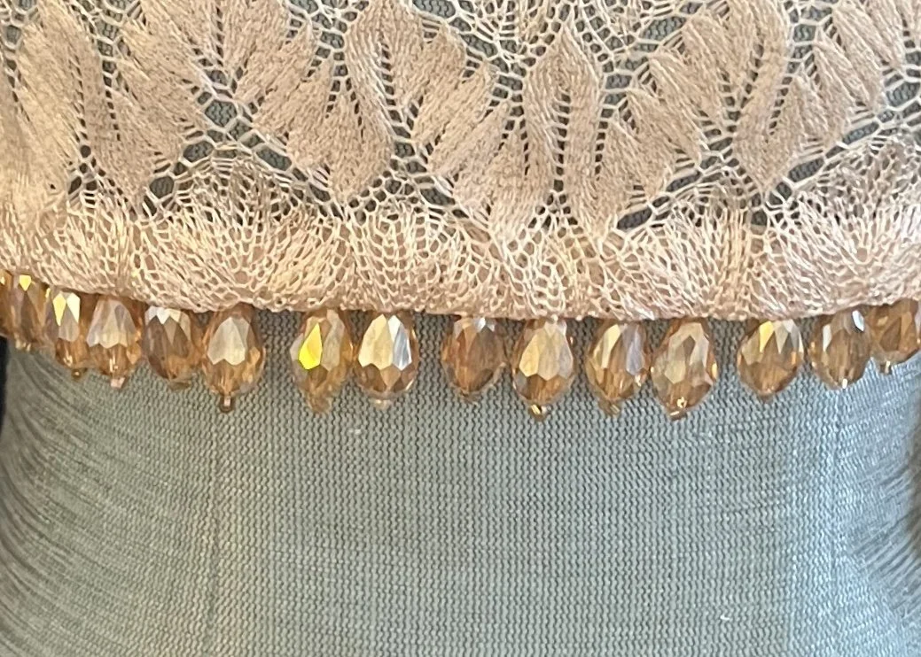 All along, I had been thinking of using some beads I had in my bead stash (yes, lousy beader though I am, I have still managed to accumulate many beads in my travels through life). They were beige coloured, teardrop shaped beads left over from a piece of lamp fringe I had mined for beads for my Titanic dress at school. In my mind, there were many of these perfect little beads, sitting in my bead box, waiting eagerly to be used.