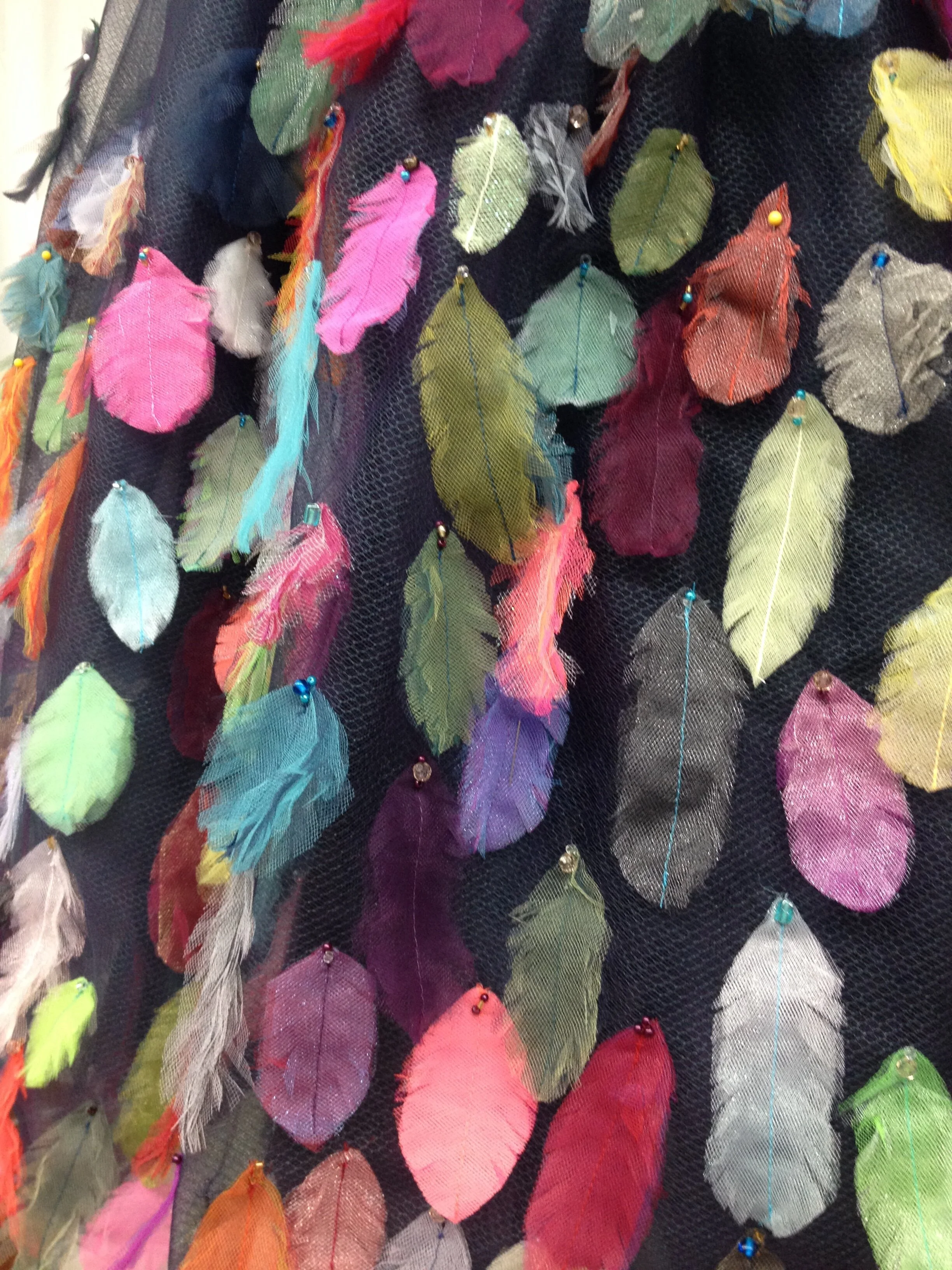 The start of this dress goes a ways back; she technically began at the tail end of 2016 when I was building a costume to wear at Costume Con which involved many feathers. Rather than buying feathers I had decided to make them out of tulle. My method was to layer up a few small squares or rectangles of various colours, fold them a few times and stitch down the middle then trim into a feather shape. It's a laborious and tedious process but the end result is kind of cool. A byproduct of this particular craft is a pile of tiny pieces of tulle in random shapes.