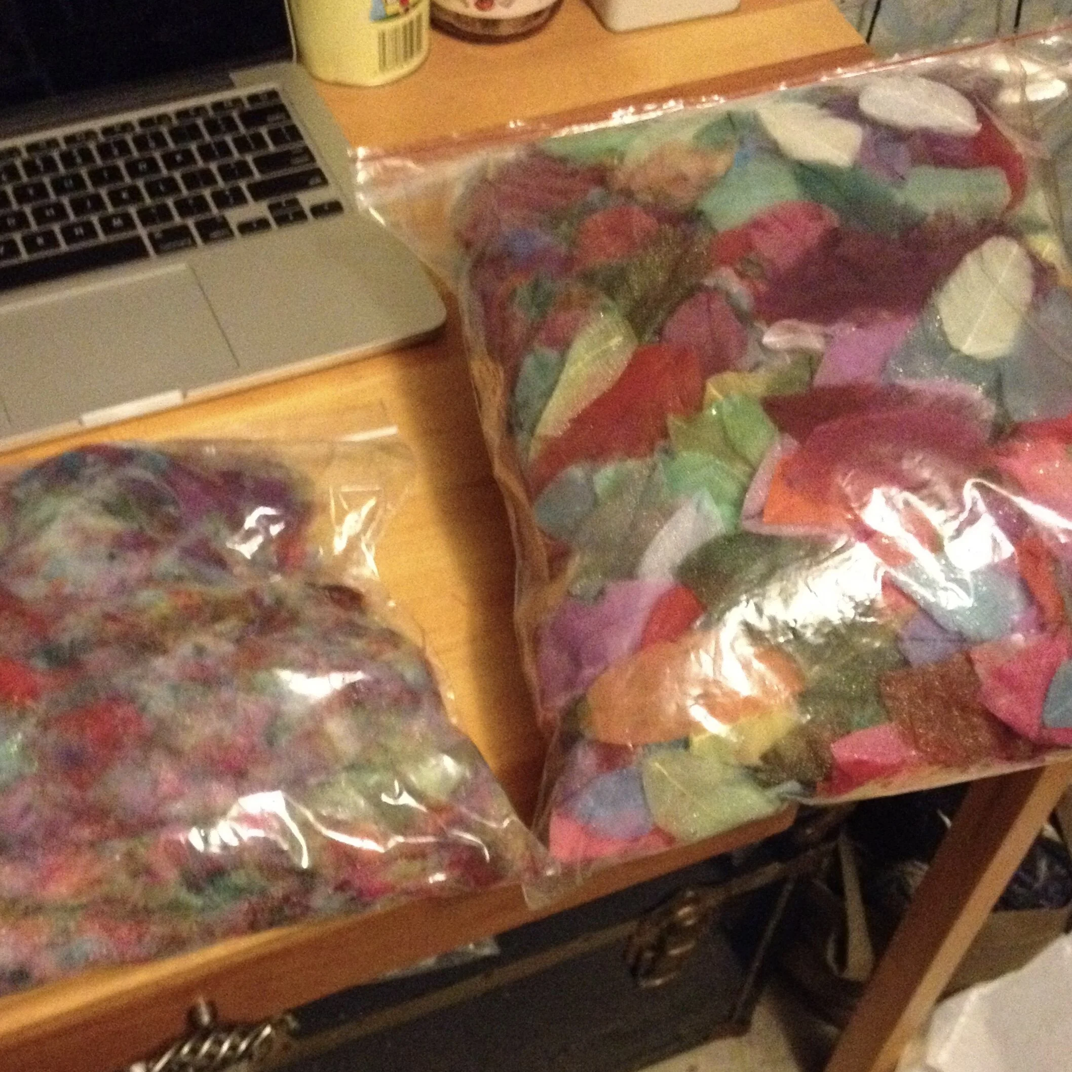 While I was snipping away and accumulating my little pile of scraps I kept thinking to myself that it actually kind of looked rather pretty. Because the pieces were so small, all the colours mingled together and the contrast of the really bright pieces with the darker colours had some interesting dimension and looked really cool. It seemed a shame to just throw it all out.