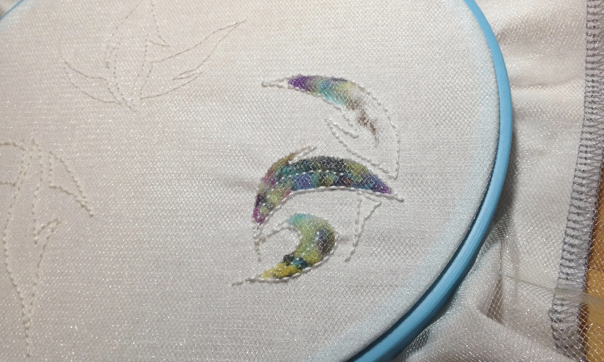 I decided to use the scraps as the stuffing in a design using trapunto quilting. Trapunto is a style of quilting where, rather than sandwiching batting between two layers before stitching a design, two layers of fabric are stitched together in a design and the pattern is stuffed through a slit in the back layer of fabric. It occurred to me that if one used a fairly sheer fabric, such as a chiffon or tulle, as the top layer the stuffing would be visible. I ended up using tulle because it is a little more sheer. I also had several large pieces lying around in my stash.