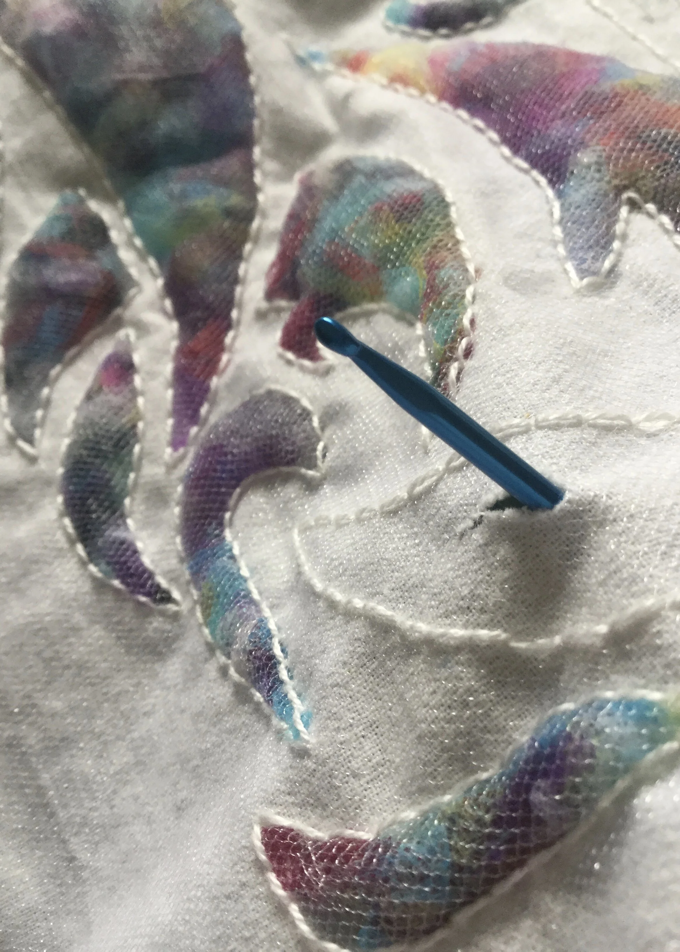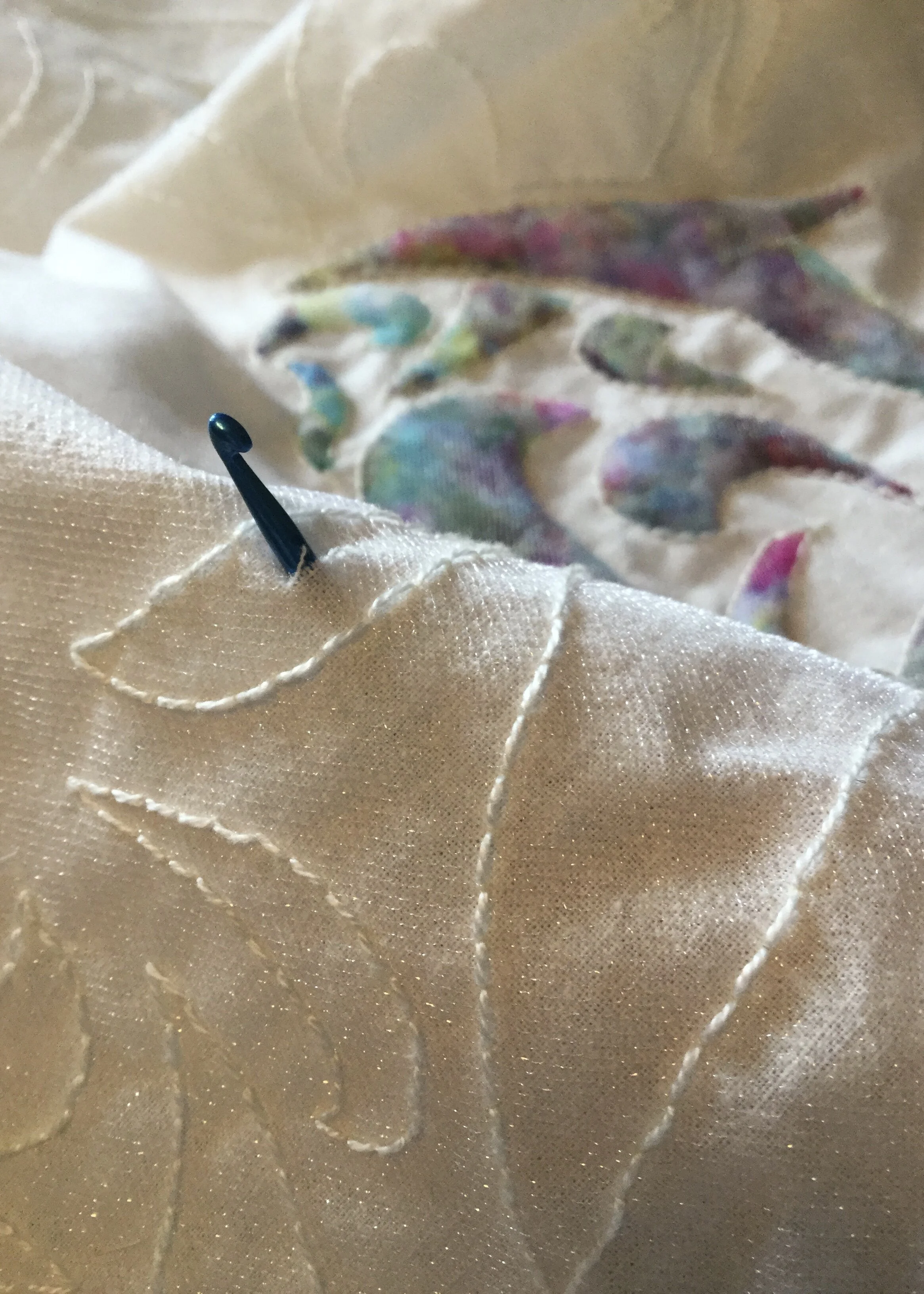Once I had all my leafy/feathery shapes stitched I could begin the process of cutting open the little pockets and stuffing them. After a little bit of trial and error I settled on a process of separating the cotton and the tulle (learned how vigilant I had to be about that the hard way), snipping into the cotton with my needle nose snips, as they were the ones which could pierce the fabric, switching to my less pointy snips to open up the slit a little further, stuffing small wads of tulle scraps into the slit, using a crochet hook to push them in and around a little and finally coaxing pieces into the corners from the right side using my thread puller. Once I was happy with the density of the stuffing I closed the slit with a whip stitch.