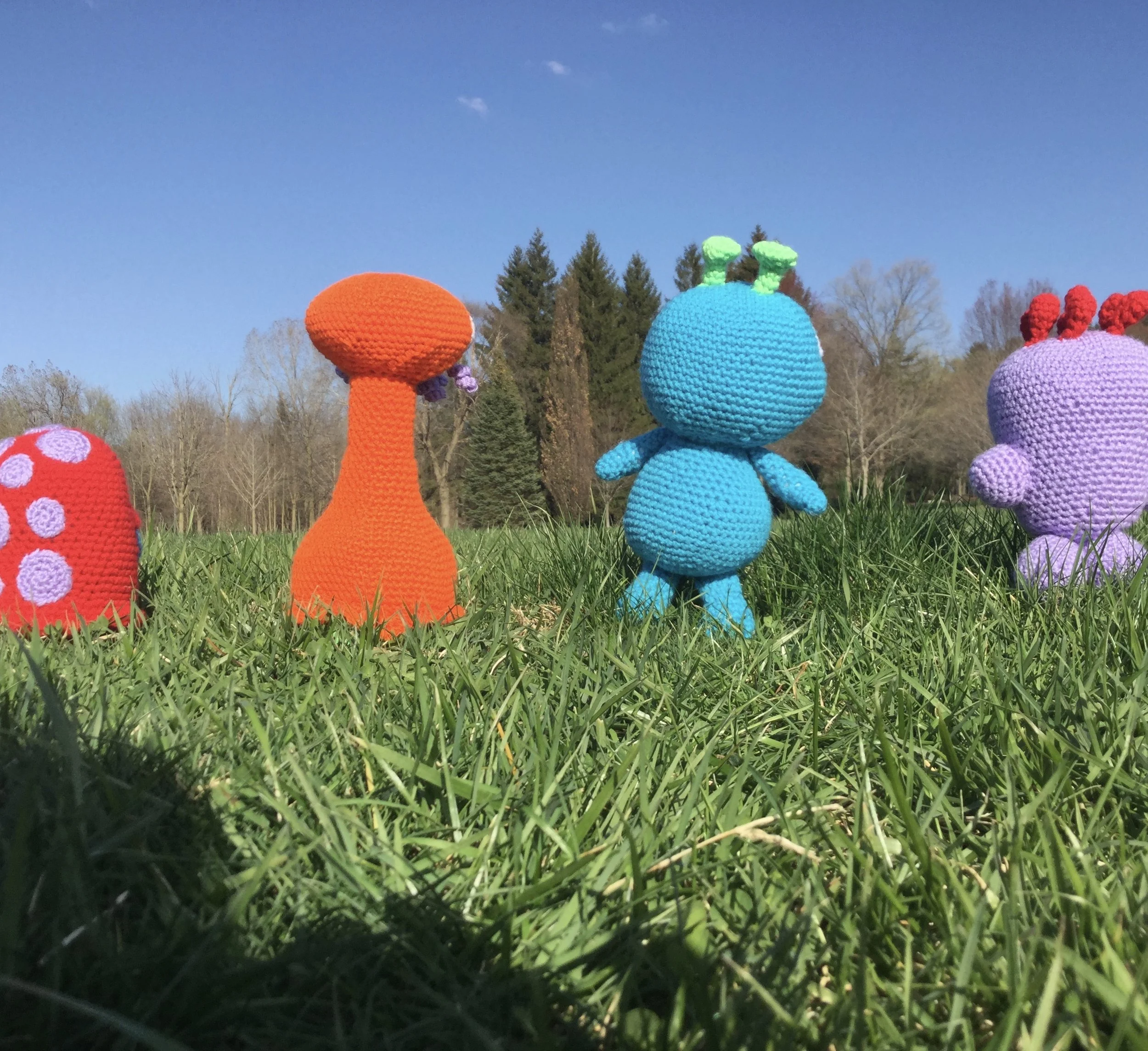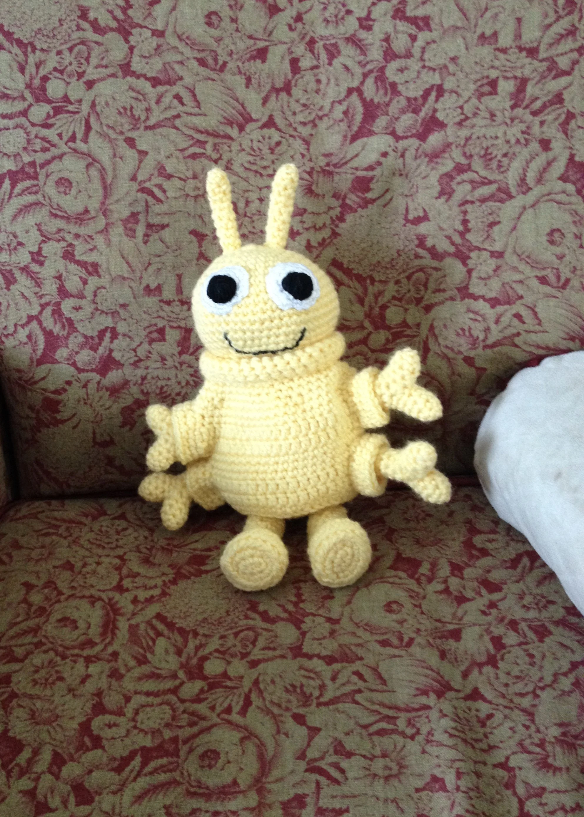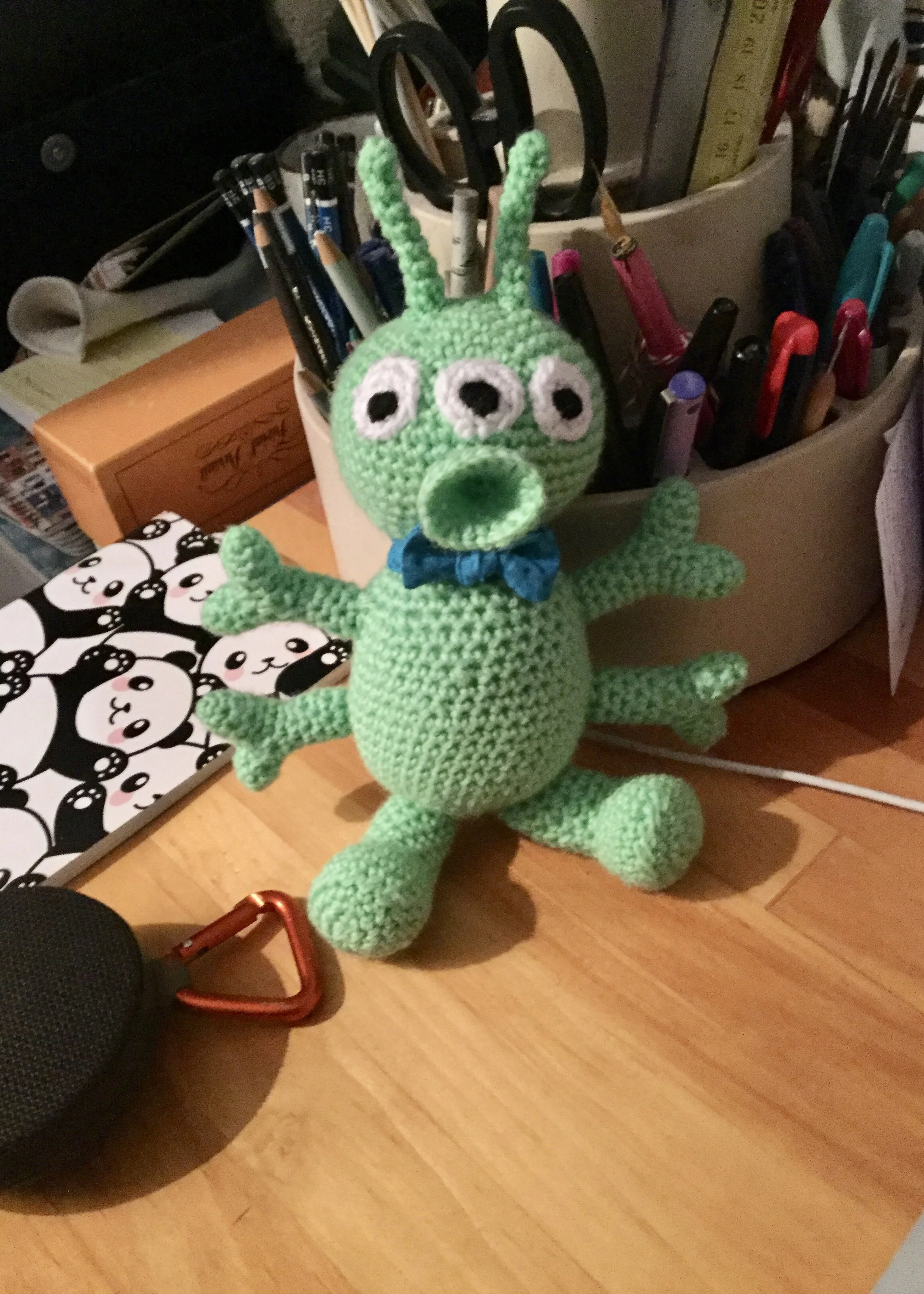 Until then, I had always used existing patterns rather than making up my own; I was still learning and coming to understand the ins and outs of how to make shapes with crochet. Goldbug was the first pattern I can say I created on my own - not that most of the shapes were all that complicated to figure out. Upon completing him, it occurred to me that if I were to make him with bright green yarn and add an eye or two he would make a good alien.