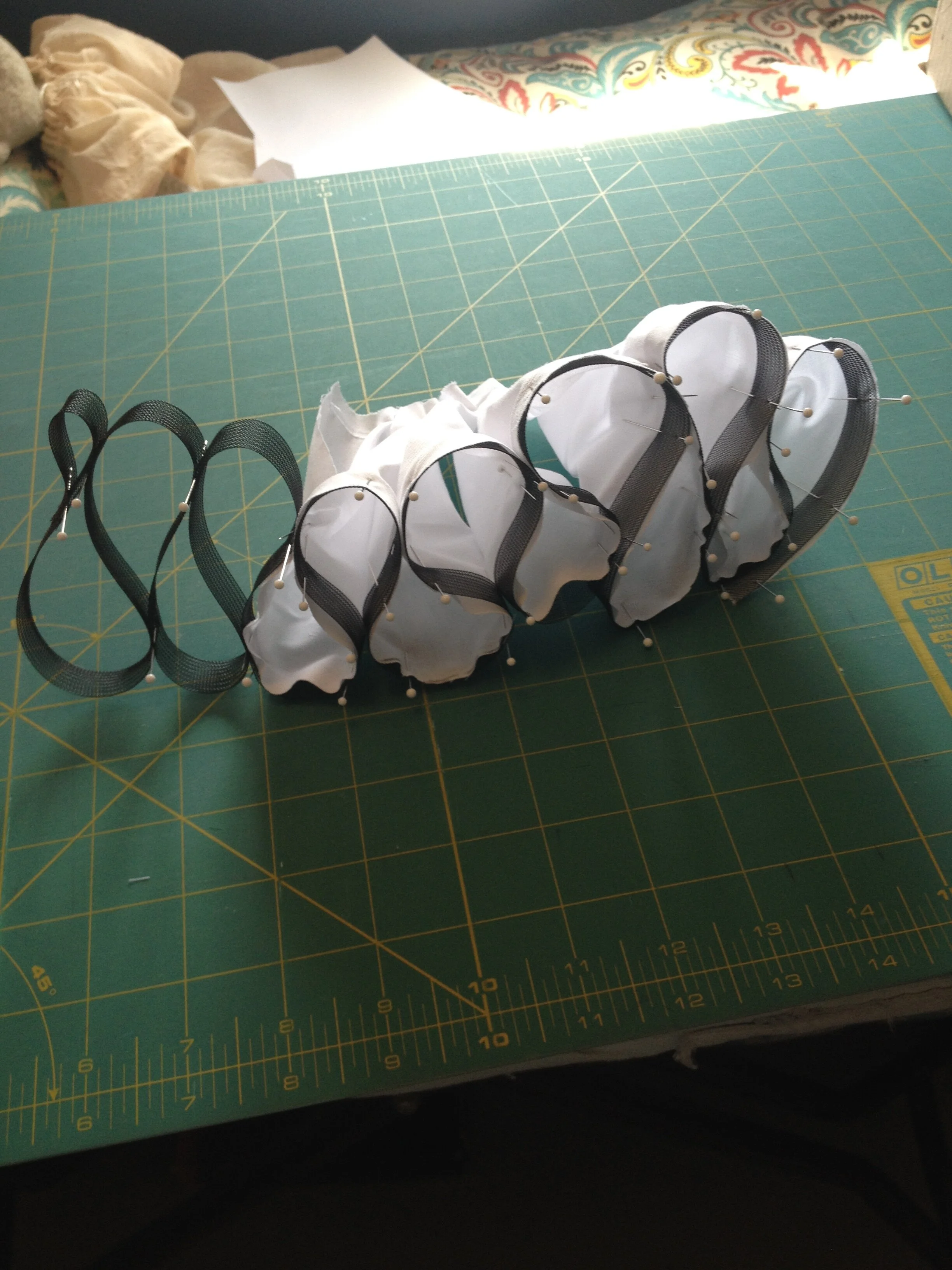 Soooooo... the fist idea was to cut a circle and open it up along the radius so that the centre would sit at the waistline and the fullness would be shaped into the ruff. I pinned a strip of crin along the outside edge to stiffen it and help it keep the shape I wanted and was overall pleased with the results. However, the full circumference of the circle wasn't long enough to cover the distance I needed it to, at least not with nice big folds which would look similar to the rest of the skirt.